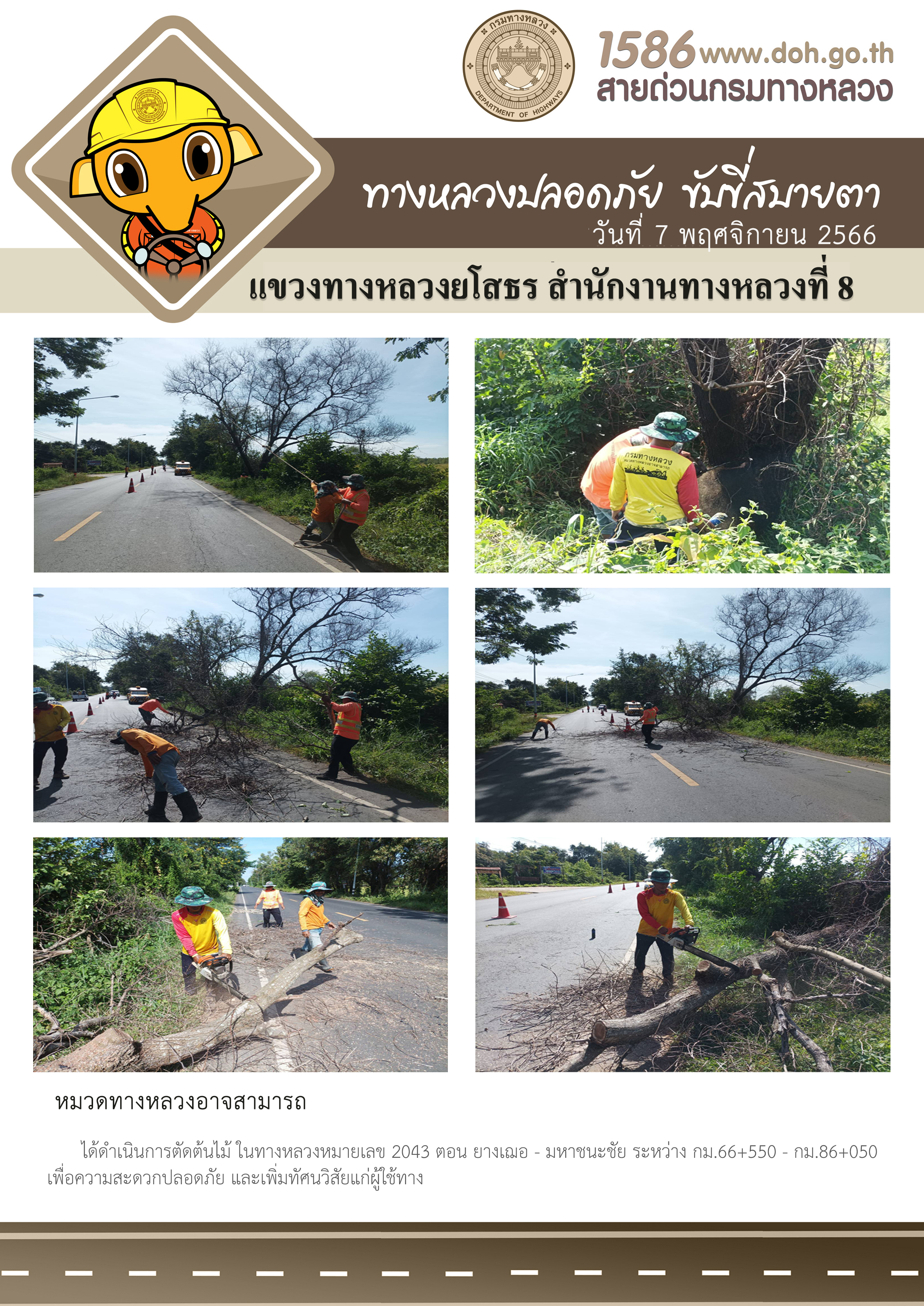 วันที่ 7 พฤศจิกายน 2566 หมวดทางหลวงอาจสามารถ ได้ดำเนินการตัดต้นไม้ ในทางหลวงหมายเลข 2043 ตอน ยางเฌอ - มหาชนะชัย ระหว่าง กม.66+550 - กม.86+050 เพื่อความสะดวกปลอดภัย และเพิ่มทัศนวิสัยแก่ผู้ใช้ทาง
