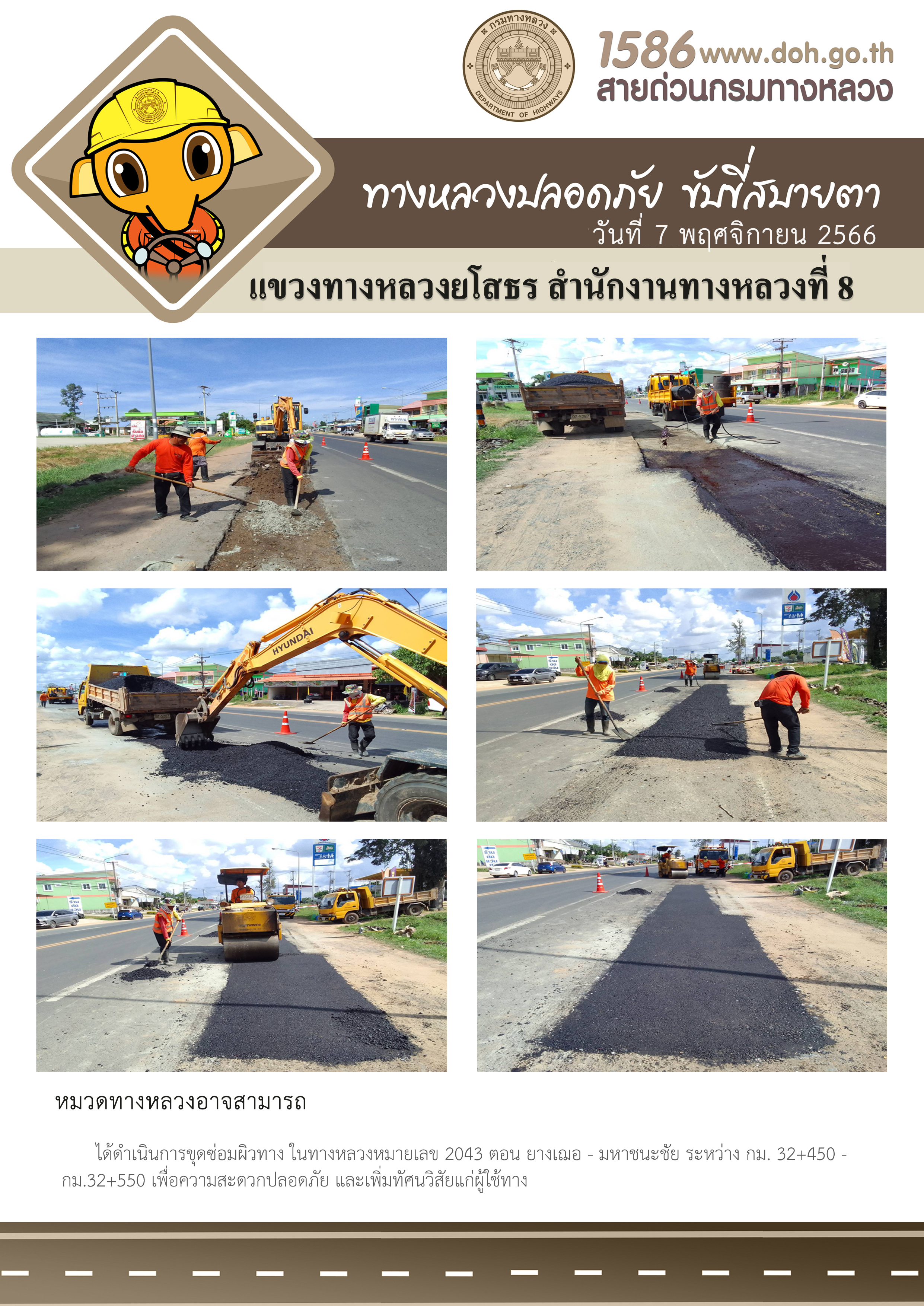 วันที่ 7 พฤศจิกายน 2566 หมวดทางหลวงอาจสามารถ ได้ดำเนินการขุดซ่อมผิวทาง ในทางหลวงหมายเลข 2043 ตอน ยางเฌอ - มหาชนะชัย ระหว่าง กม.32+450 - กม.32+550 เพื่อความสะดวกปลอดภัย และเพิ่มทัศนวิสัยแก่ผู้ใช้ทาง