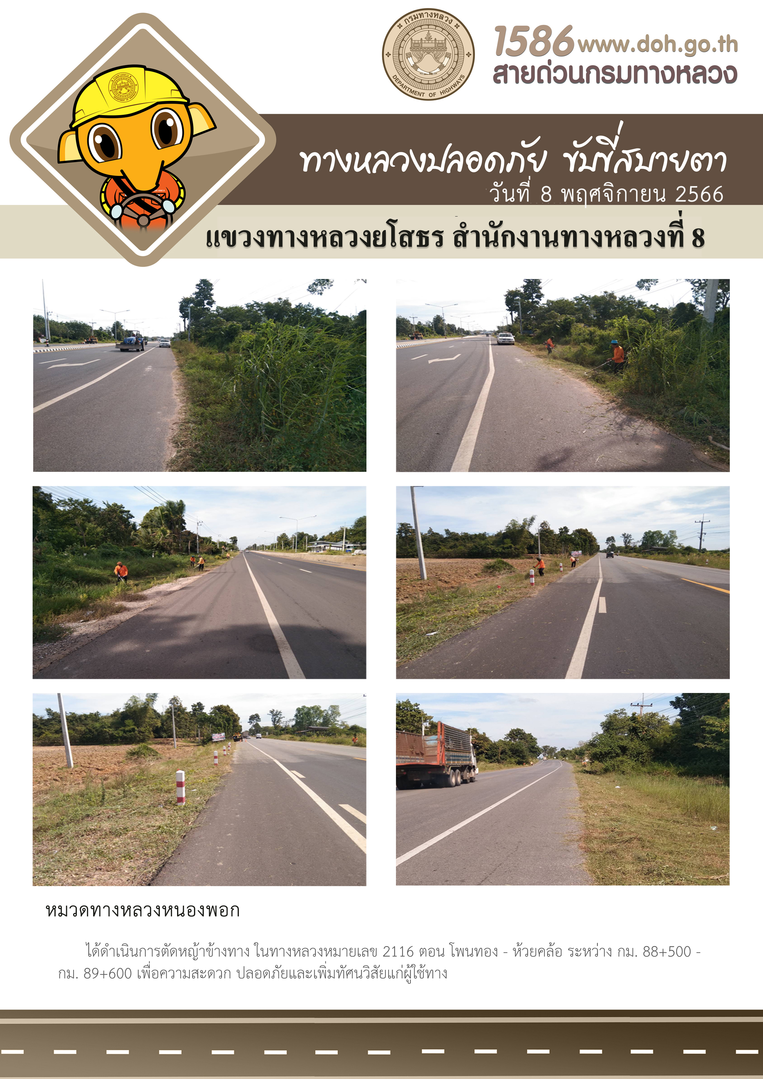 วันที่ 8 พฤศจิกายน 2566 หมวดทางหลวงหนองพอก ได้ดำเนินการตัดหญ้าข้างทาง ในทางหลวงหมายเลข 2116 ตอน โพนทอง - ห้วยคล้อ ระหว่าง กม.88+500 - กม.89+600 เพื่อความสะดวก ปลอดภัยและเพิ่มทัศนวิสัยแก่ผู้ใช้ทาง