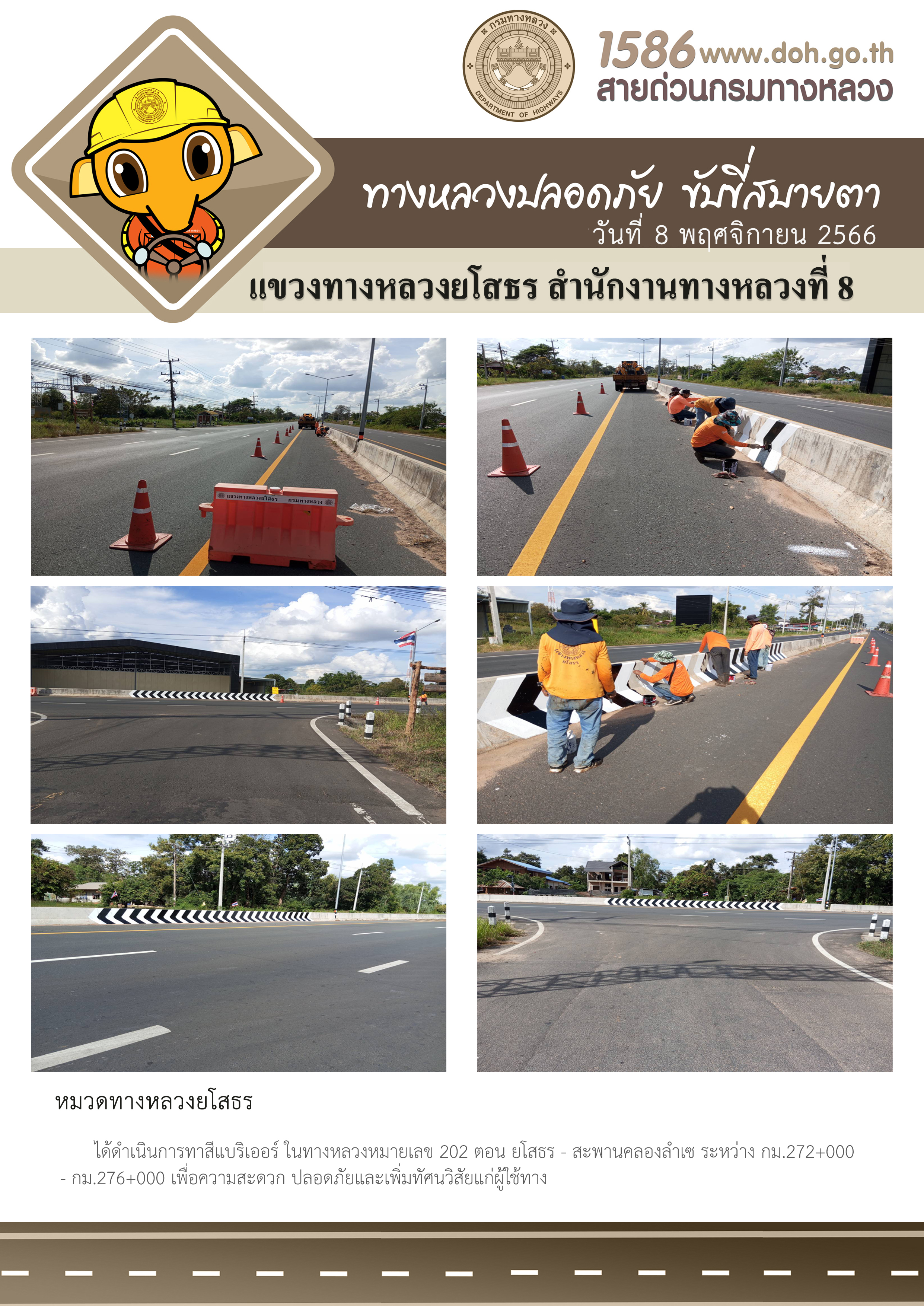 วันที่ 8 พฤศจิกายน 2566 หมวดทางหลวงยโสธร ได้ดำเนินการทาสีแบริเออร์ ในทางหลวงหมายเลข 202 ตอน ยโสธร - สะพานคลองลำเซ ระหว่าง กม.272+000 - กม.276+000 เพื่อความสะดวก ปลอดภัยและเพิ่มทัศนวิสัยแก่ผู้ใช้ทาง