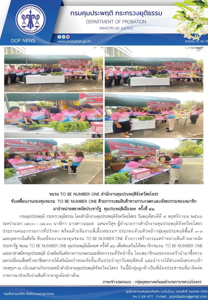ชมรม TO BE NUMBER ONE สำนักงานคุมประพฤติจังหวัดยโสธร ขับเคลื่อนงานกองทุนชมรม TO BE NUMBER ONE ด้วยการระดมสินค้าทางการเกษตรและหัตถกรรมของสมาชิก มาจำหน่ายตลาดนัดประชารัฐ คุมประพฤติเมืองยศ ครั้งที่ ๔๓