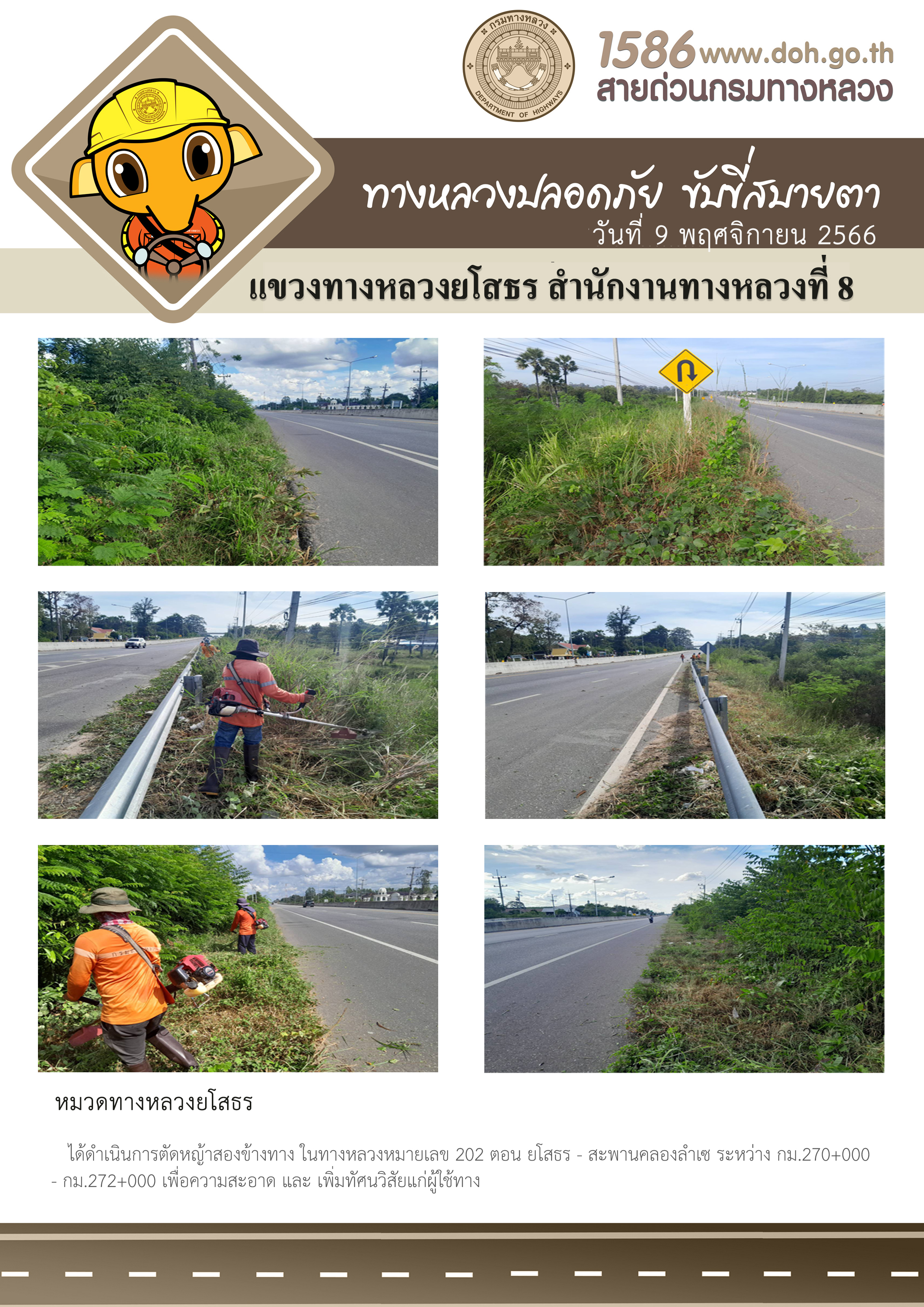 วันที่ 9 พฤศจิกายน 2566 หมวดทางหลวงยโสธร ได้ดำเนินการตัดหญ้าสองข้างทาง ในทางหลวงหมายเลข 202 ตอน ยโสธร - สะพานคลองลำเซ ระหว่าง กม.270+000 - กม.272+000 เพื่อความสะอาด และเพิ่มทัศนวิสัยแก่ผู้ใช้ทาง