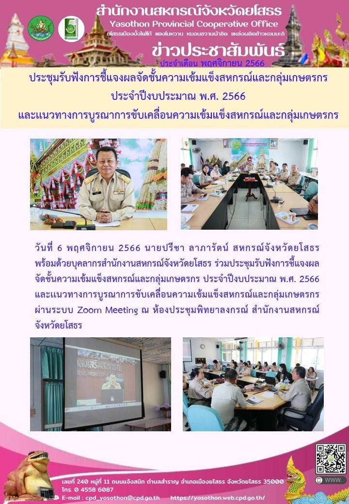 นายปรีชา ลาภารัตน์ สหกรณ์จังหวัดยโสธร พร้อมด้วยบุคลากรสำนักงานสหกรณ์จังหวัดยโสธร ร่วมประชุมชี้แจงผลการจัดชั้นความเข้มแข็งของสหกรณ์และกลุ่มเกษตรกร ณ ห้องพิทยาลงกรณ์ สำนักงานสหกรณ์จังหวัดยโสธร