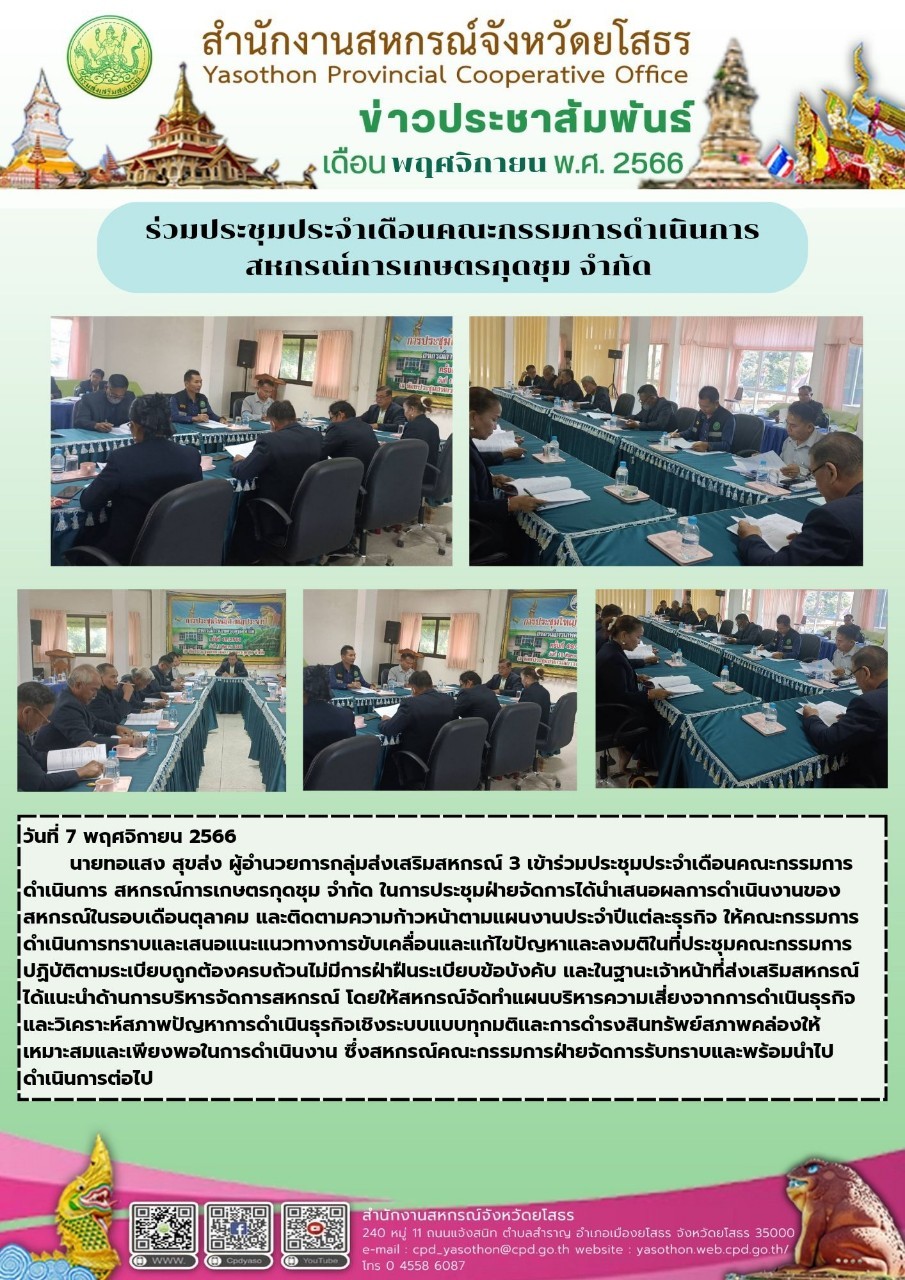 นายทอแสง สุขส่ง ผู้อำนวยกลุ่มส่งเสริมสหกรณ์ 3 เข้าร่วมประชุมประจำเดือนคณะกรรมการดำเนินการ ณ สหกรณ์การเกษตรกุดชุม จำกัด