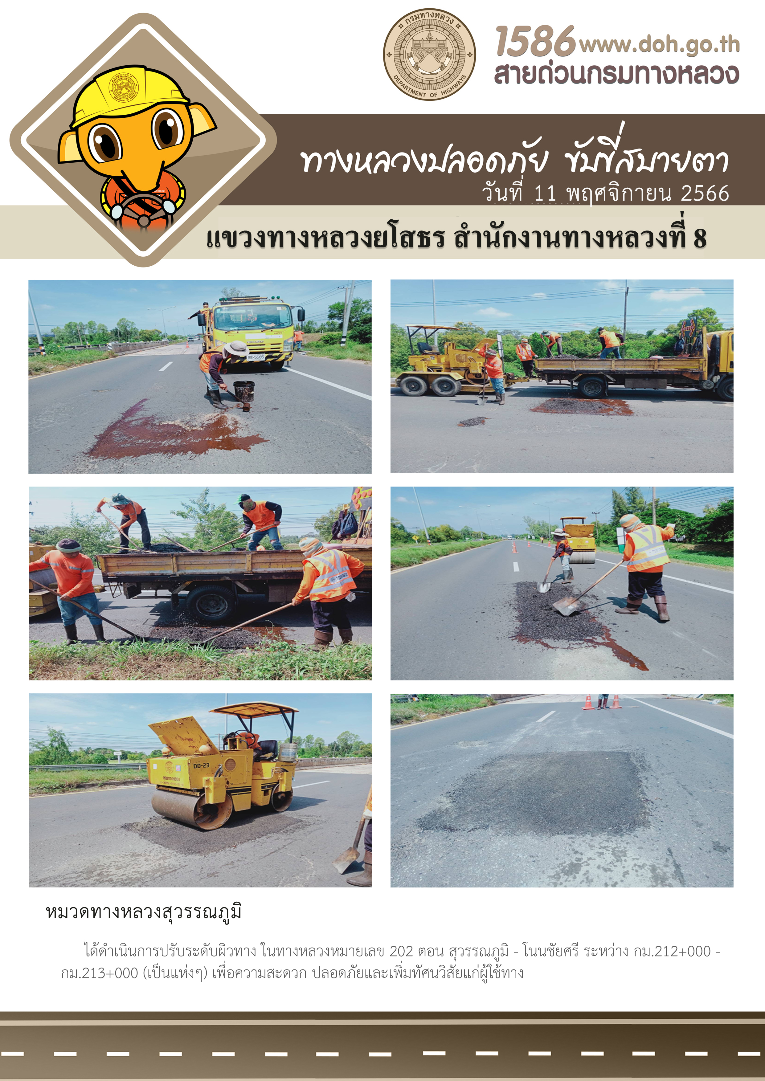 วันที่ 10 พฤศจิกายน 2566 หมวดทางหลวงสุวรรณภูมิ ได้ดำเนินการปรับระดับผิวทาง ในทางหลวงหมายเลข 202 ตอน สุวรรณภูมิ - โนนชัยศรี ระหว่าง กม.212+000 - กม.213+000 (เป็นแห่งๆ) เพื่อความสะดวก ปลอดภัยและเพิ่มทัศนวิสัยแก่ผู้ใช้ทาง