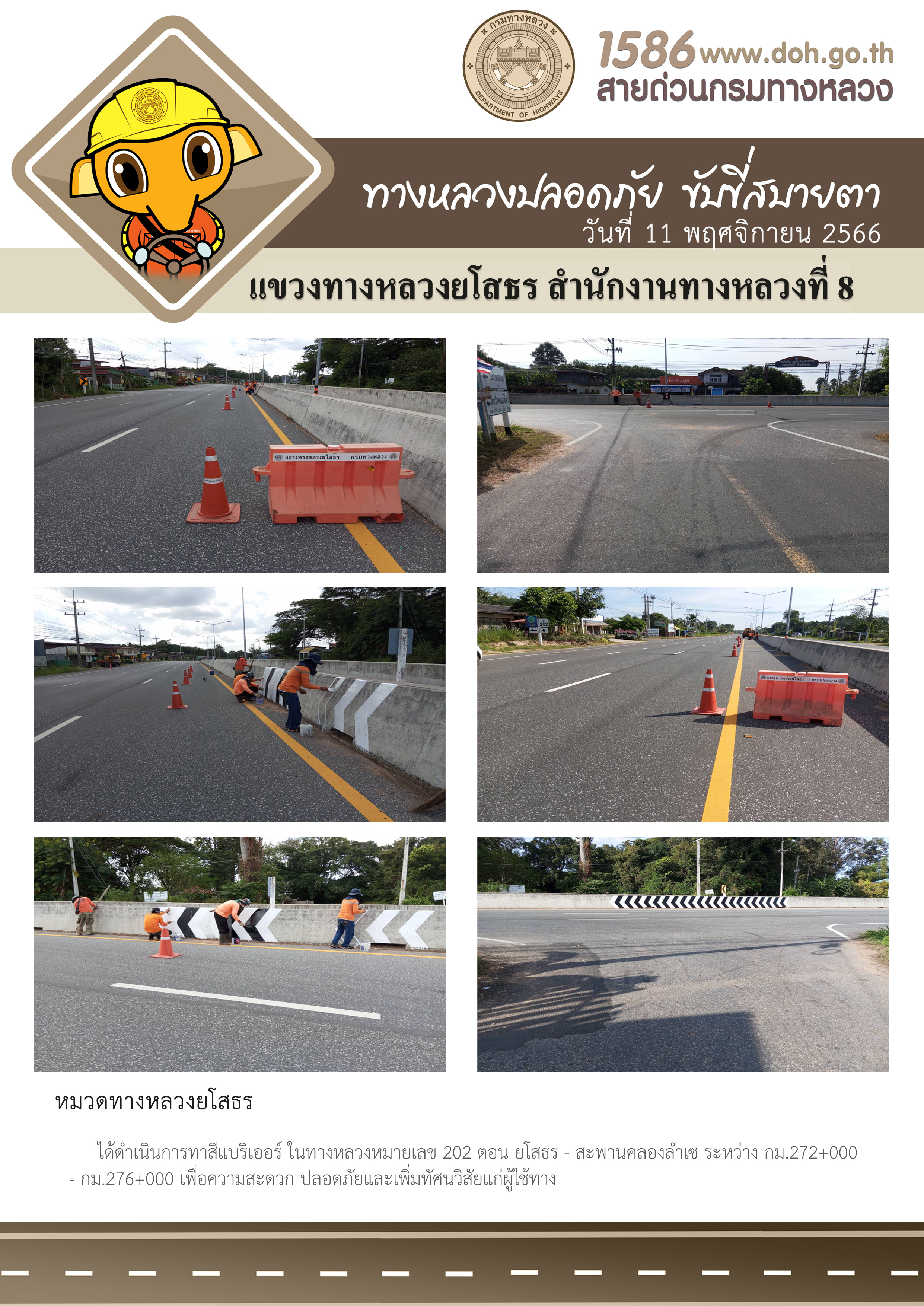 วันที่ 10 พฤศจิกายน 2566 หมวดทางหลวงยโสธร ได้ดำเนินการทาสีแบริเออร์ ในทางหลวงหมายเลข 202 ตอน ยโสธร - สะพานคลองลำเซ ระหว่าง กม.272+000 - กม.276+000 เพื่อความสะดวก ปลอดภัยและเพิ่มทัศนวิสัยแก่ผู้ใช้ทาง