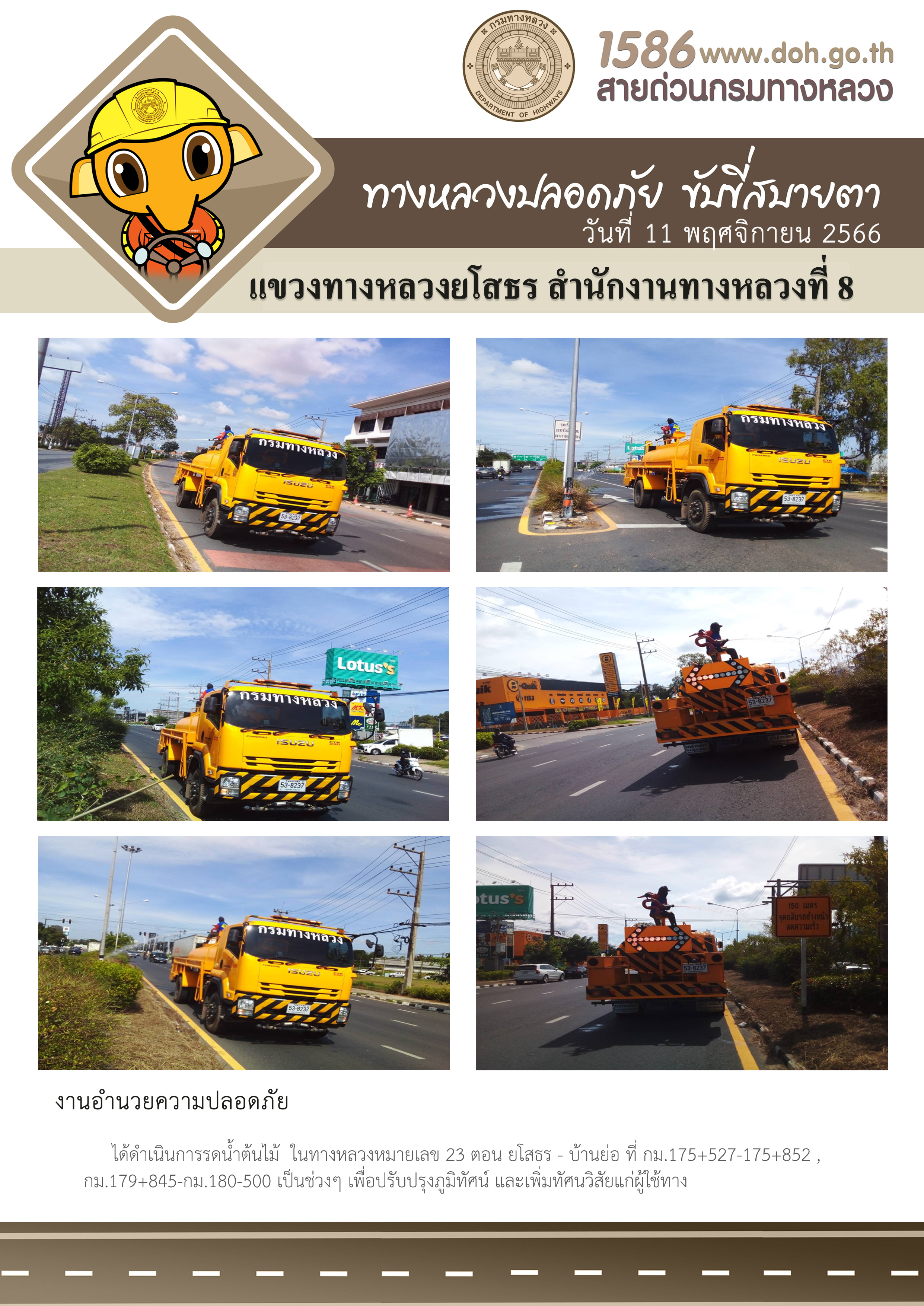 วันที่ 10 พฤศจิกายน 2566 งานอำนวยความปลอดภัย ได้ดำเนินการรดน้ำต้นไม้ ในทางหลวงหมายเลข 23 ตอน ยโสธร - บ้านย่อ ที่ กม.175+527 - กม.175+852 , กม.179+845 - กม.180+500 เป็นช่วงๆ เพื่อปรับปรุงภูมิทัศน์ และเพิ่มทัศนวิสัยแก่ผู้ใช้ทาง
