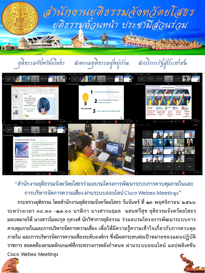 สำนักงานยุติธรรมจังหวัดยโสธรร่วมอบรมโครงการพัฒนาระบบการควบคุมภายในและการบริหารจัดการความเสี่ยง ผ่านระบบออนไลน์ Cisco Webex Meetings