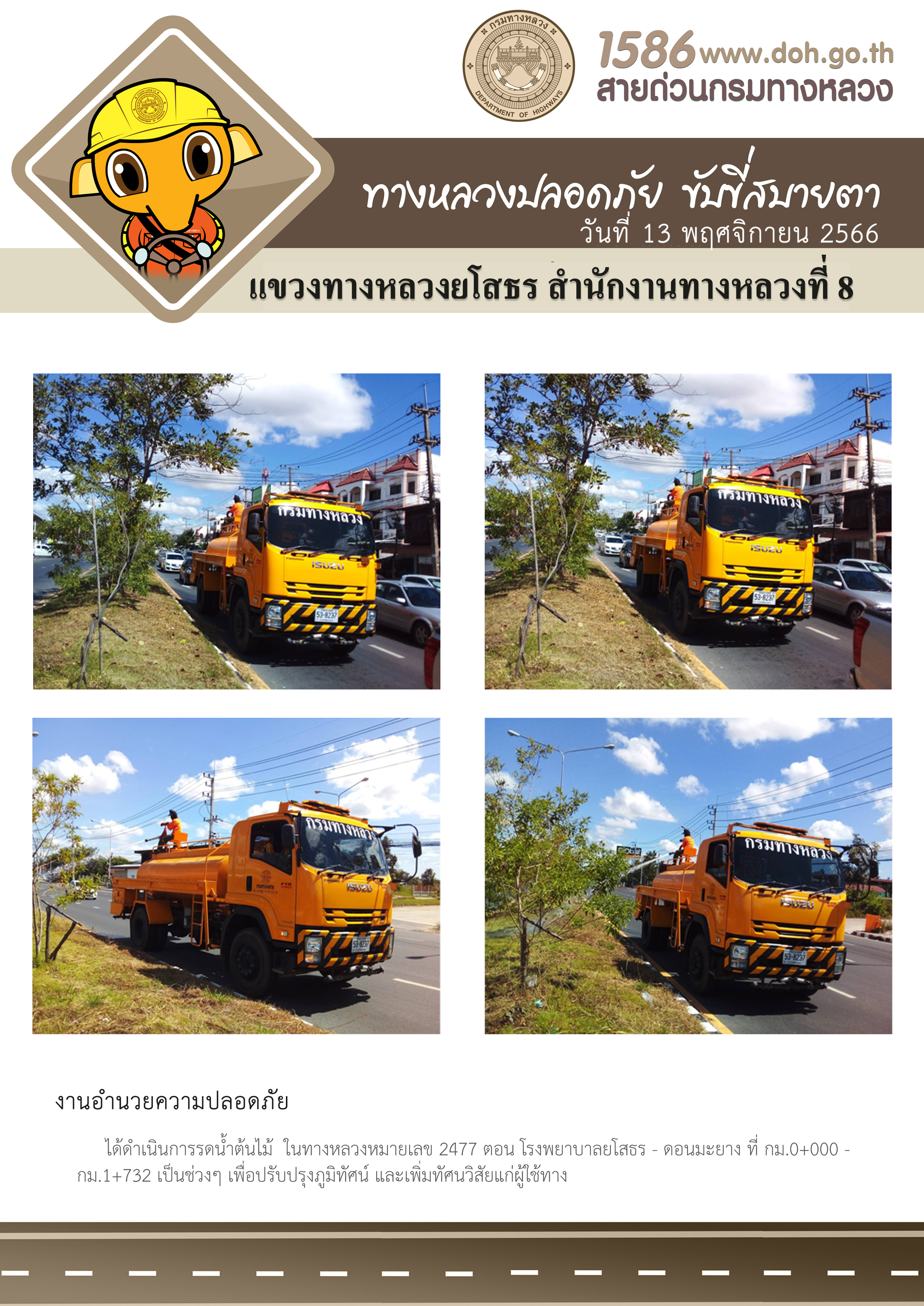 วันที่ 13 พฤศจิกายน 2566 งานอำนวยความปลอดภัย ได้ดำเนินการรดน้ำต้นไม้ ในทางหลวงหมายเลข 2477 ตอน โรงพยาบาลยโสธร - ดอนมะยาง ที่ กม.0+000 - กม.1+732 เป็นช่วงๆ เพื่อปรับปรุงภูมิทัศน์ และเพิ่มทัศนวิสัยแก่ผู้ใช้ทาง