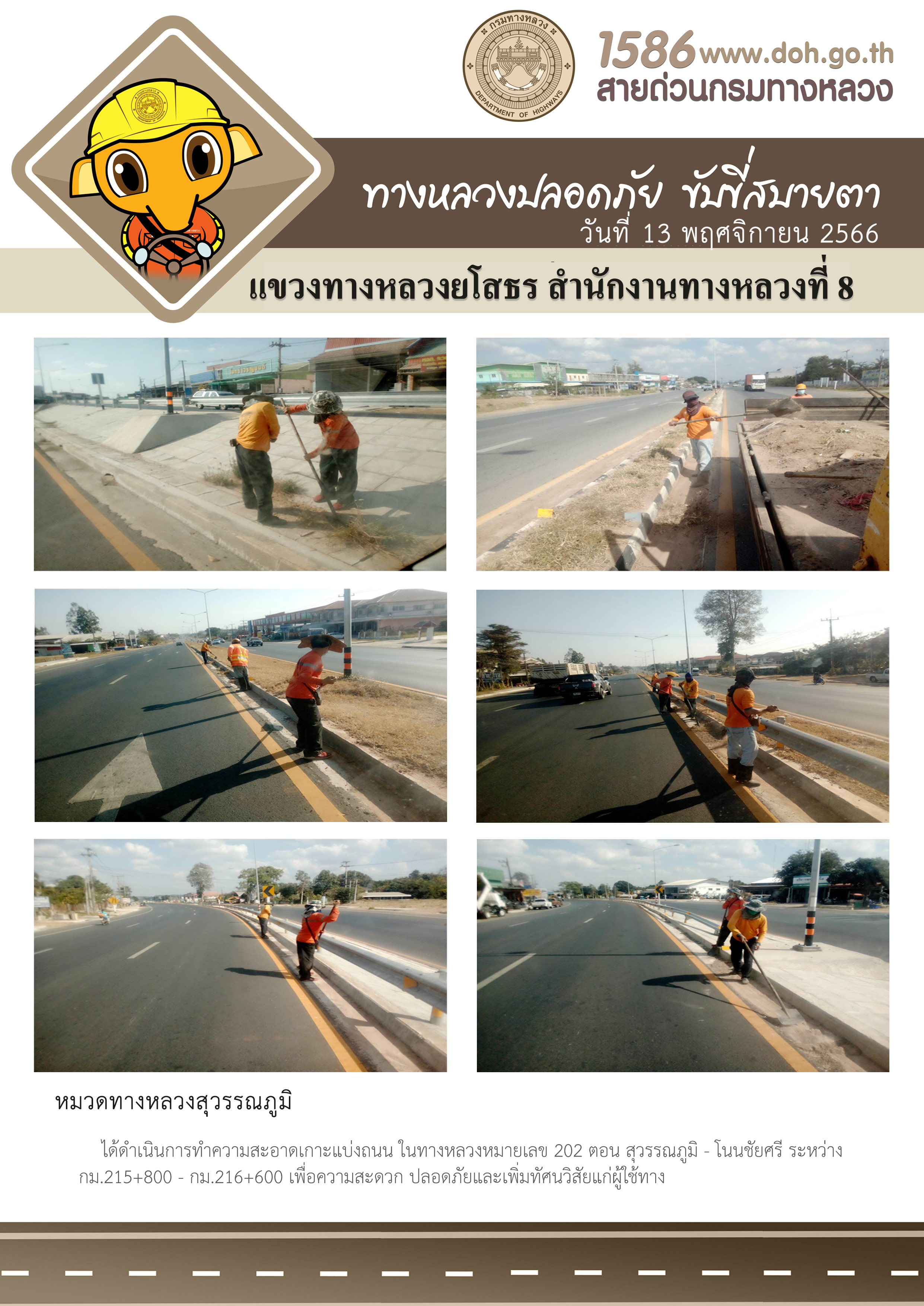 วันที่ 13 พฤศจิกายน 2566 หมวดทางหลวงสุวรรณภูมิ ได้ดำเนินการทำความสะอาดเกาะแบ่งถนน ในทางหลวงหมายเลข 202 ตอน สุวรรณภูมิ - โนนชัยศรี ระหว่าง กม.215+800 - กม.216+600 เพื่อความสะดวก ปลอดภัยและเพิ่มทัศนวิสัยแก่ผู้ใช้ทาง