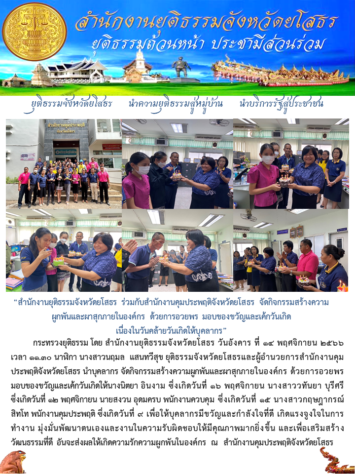 14 พฤศจิกายน 2566 สำนักงานยุติธรรมจังหวัดยโสธร ร่วมกับสำนักงานคุมประพฤติจังหวัดยโสธร จัดกิจกรรมสร้างความผูกพันและผาสุกภายในองค์กร ด้วยการอวยพร มอบของขวัญและเค้กวันเกิด เนื่องในวันคล้ายวันเกิดให้บุคลากร