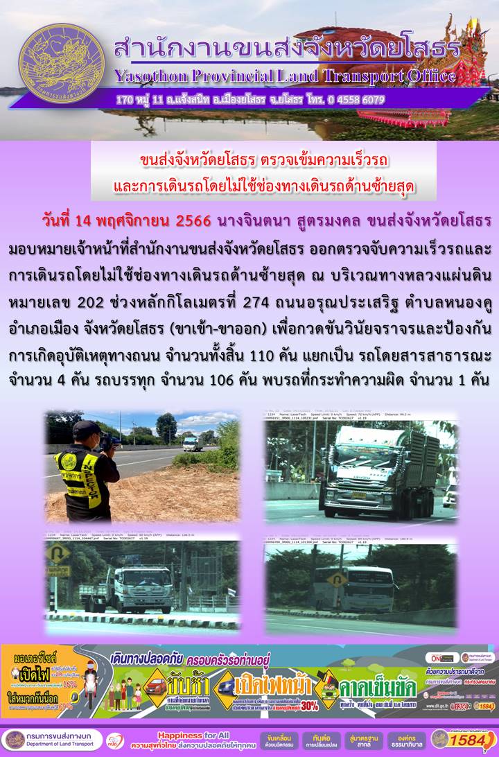 วันที่ 14 พฤศจิกายน 2566 เจ้าหน้าที่สำนักงานขนส่งจังหวัดยโสธร ออกตั้งจุดตรวจจับความเร็ว