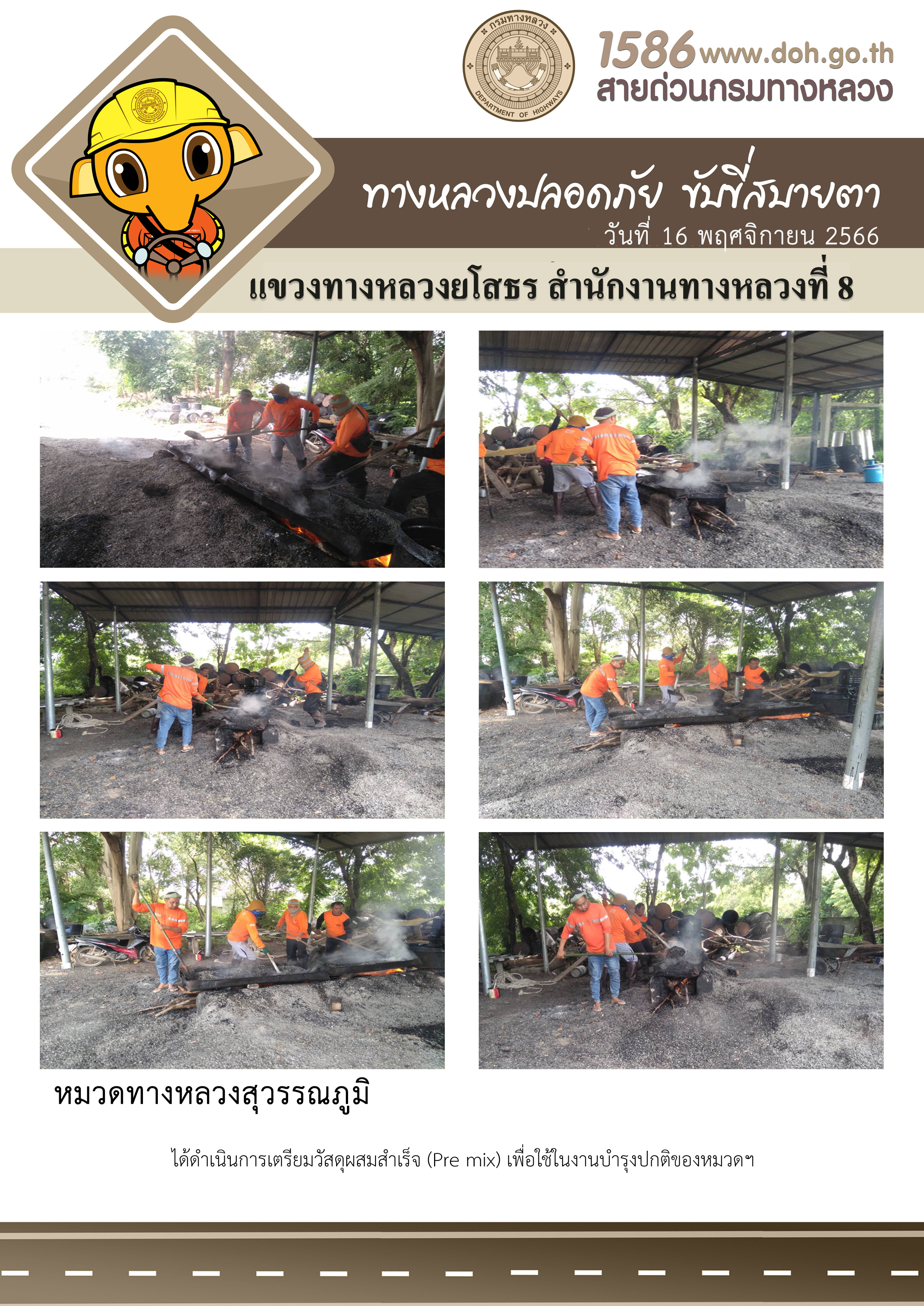 วันที่ 16 พฤศจิกายน 2566 หมวดทางหลวงสุวรรณภูมิ ได้ดำเนินการเตรียมวัสดุผสมสำเร็จ (Pre mix) เพื่อใช้ในงานบำรุงปกติของหมวดฯ