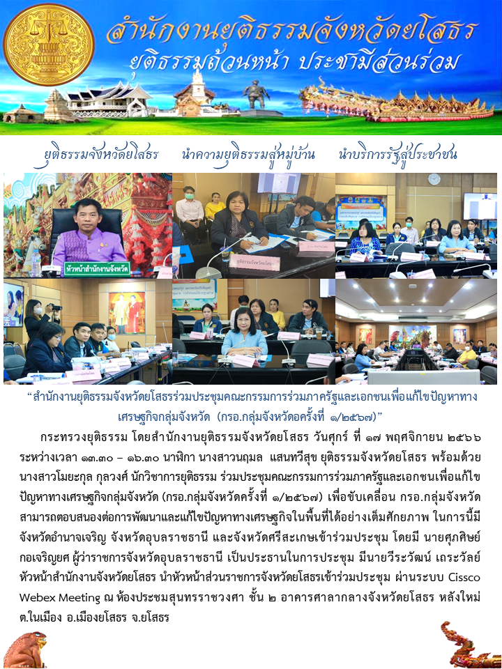 วันที่ 17 พ.ย. 2566 (16:01 น.)กระทรวงยุติธรรม โดยสำนักงานยุติธรรมจังหวัดยโสธร วันศุกร์ ที่ 17 พฤศจิกายน 2566 ระหว่างเวลา 13.30-16.30 นาฬิกา นางสาวนฤมล แสนทวีสุข ยุติธรรมจังหวัดยโสธร พร้อมด้วยนางสาวโมยะกุล กุลวงศ์ นักวิชาการยุติธรรม ร่วมประชุมคณะกรรมการร่วมภาครัฐและเอกชนเพื่อแก้ไขปัญหาทางเศรษฐกิจกลุ่มจังหวัด (กรอ.กลุ่มจังหวัดครั้งที่ 1/2567) เพื่อขับเคลื่อน กรอ.กลุ่มจังหวัดสามารถตอบสนองต่อการพัฒนาและแก้ไขปัญหาทางเศรษฐกิจในพื้นที่ได้อย่างเต็มศักยภาพ ในการนี้มี จังหวัดอำนาจเจริญ จังหวัดอุบลราชธานี และจังหวัดศรีสะเกษเข้าร่วมประชุม โดยมี นายศุภศิษย กอเจริญยศ ผู้ว่าราชการจังหวัดอุบลราชธานี เป็นประธานในการประชุม มีนายวีระวัฒน์ เถระวัลย์ หัวหน้าสำนักงานจังหวัดยโสธร นำหัวหน้าส่วนราชการจังหวัดยโสธรเข้าร่วมประชุม ผ่านระบบ Cissco Webex Meeting ณ ห้องประชมสุนทรราชวงศา ชั้น 2 อาคารศาลากลางจังหวัดยโสธร หลังใหม่ ต.ในเมือง อ.เมืองยโสธร จ.ยโสธร