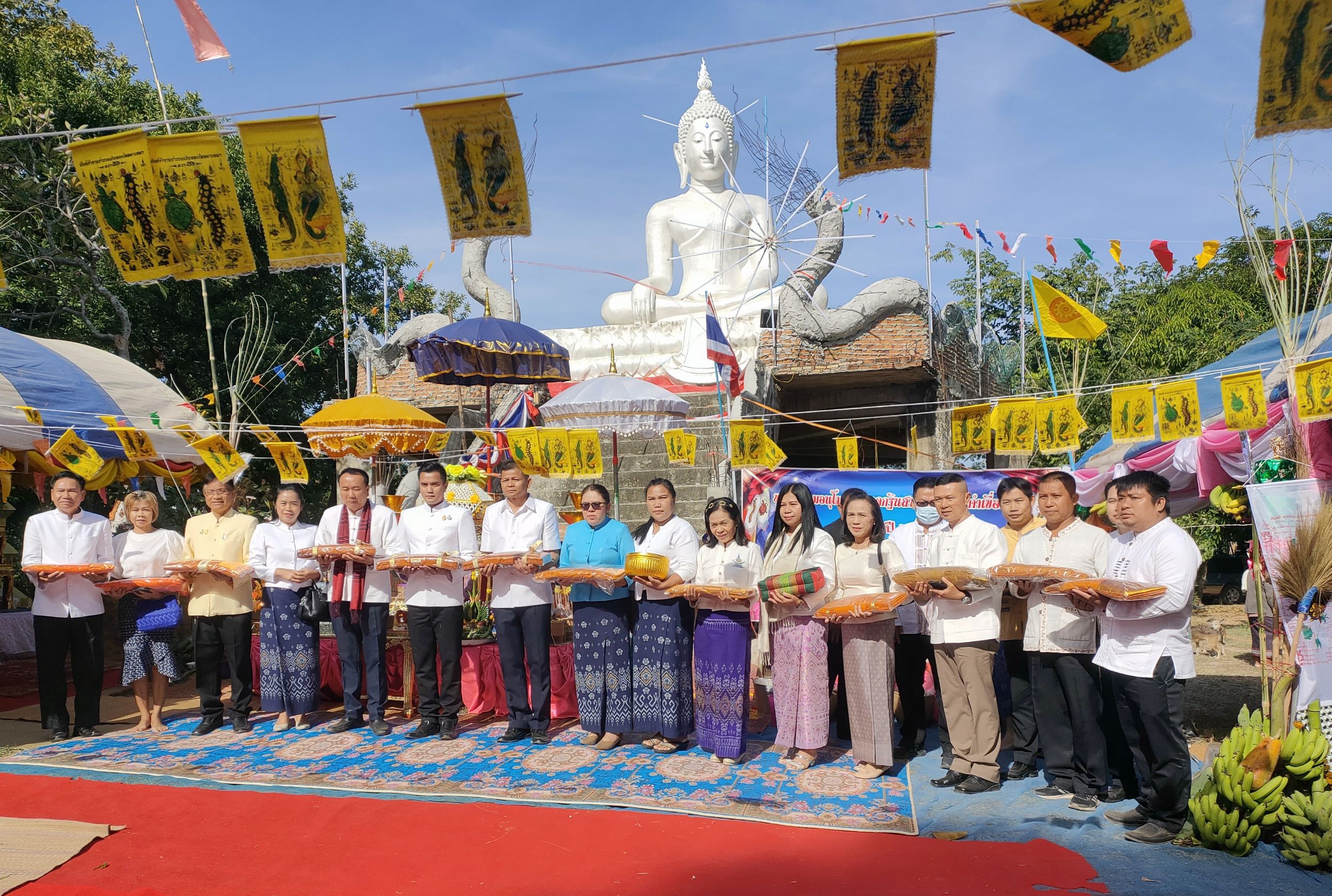 โดยมี พระครูโสภิตชาครธรรม เป็นประธานสงฆ์ มีนายบุญแก้ว สมวงศ์ สมาชิกสภาผู้แทนราษฎรจังหวัดยโสธร เขต 2 ผู้กำกับการสถานีตำรวจภูธรคำเขื่อนแก้ว หัวหน้าส่วนราชการ หัวหน้าหน่วยงาน ปลัดอำเภอ นายกอบต.กุดกุง ผู้อำนวยการโรงเรียนบ้านทรายงาม ข้าราชการ พนักงาน เจ้าหน้าที่ พี่น้องประชาชน และพุทธศาสนิกชนในพื้นที่ร่วมพิธี มียอดบริจาครวมทั้งสิ้น 525,083 บาท