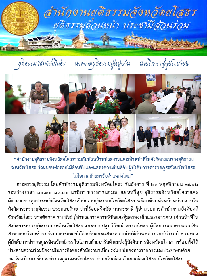 สำนักงานยุติธรรมจังหวัดยโสธรร่วมกับหัวหน้าหน่วยงานและเจ้าหน้าที่ในสังกัดกระทรวงยุติธรรม จังหวัดยโสธร ร่วมมอบช่อดอกไม้ต้อนรับและแสดงความยินดีกับผู้บังคับการตำรวจภูธรจังหวัดยโสธร ในโอกาสย้ายมารับตำแหน่งใหม่