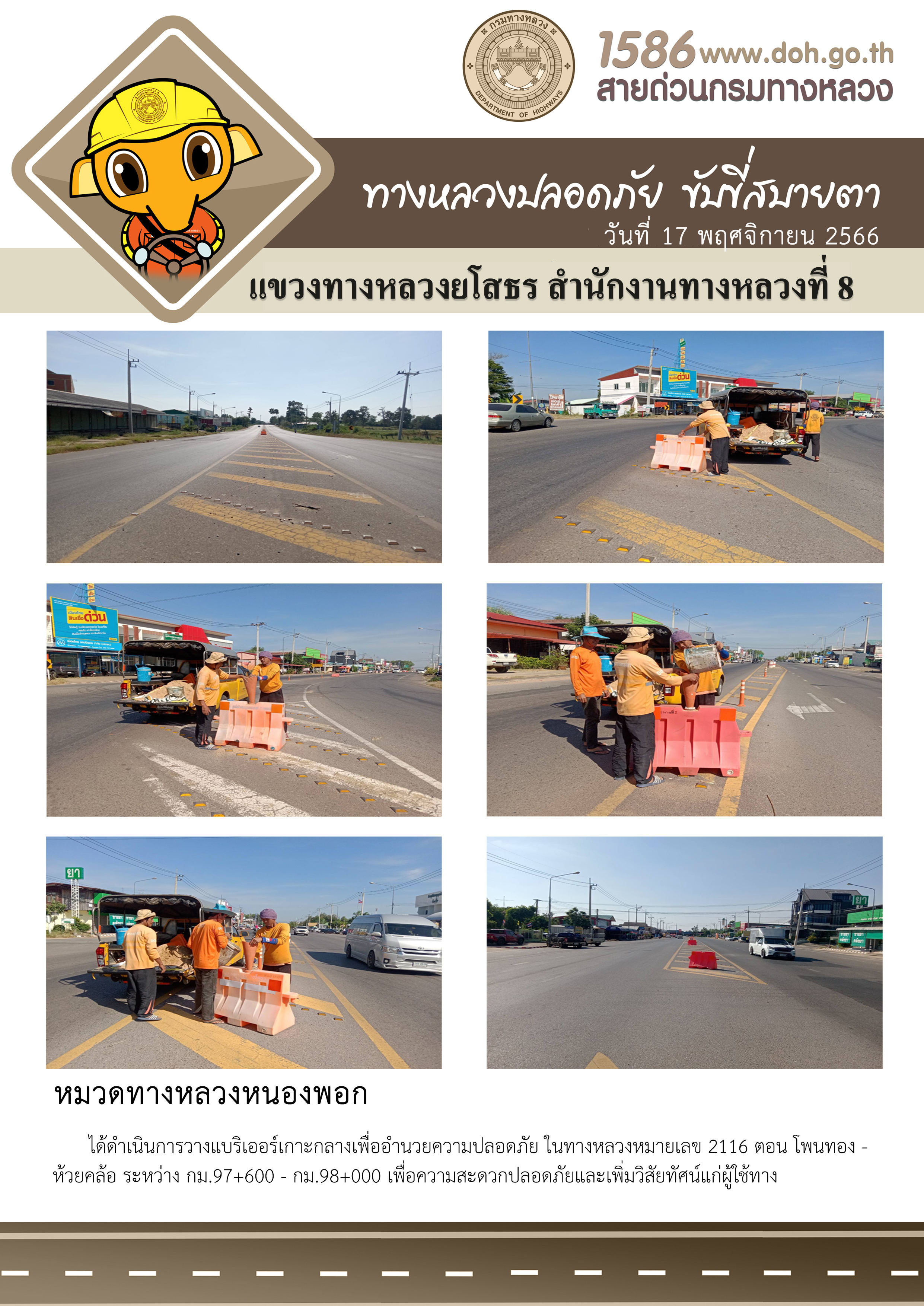 วันที่ 17 พฤศจิกายน 2566 หมวดทางหลวงหนองพอก ได้ดำเนินการวางแบริเออร์เกาะกลางเพื่ออำนวยความปลอดภัย ในทางหลวงหมายเลข 2116 ตอน โพนทอง - ห้วยคล้อ ระหว่าง กม.97+600 - กม.98+000 เพื่อความสะดวกปลอดภัยและเพิ่มวิสัยทัศน์แก่ผู้ใช้ทาง