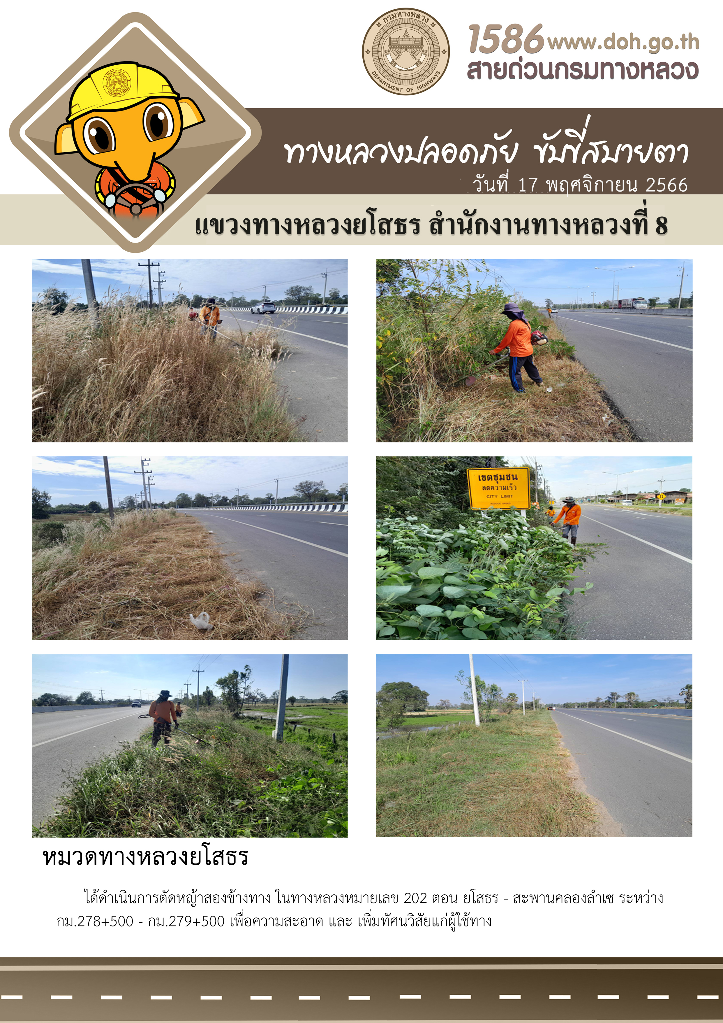 วันที่ 17 พฤศจิกายน 2566 หมวดทางหลวงยโสธร ได้ดำเนินการตัดหญ้าสองข้างทาง ในทางหลวงหมายเลข 202 ตอน ยโสธร - สะพานคลองลำเซ ระหว่าง กม.278+500 - กม.279+500 เพื่อความสะอาด และเพิ่มทัศนวิสัยแก่ผู้ใช้ทาง