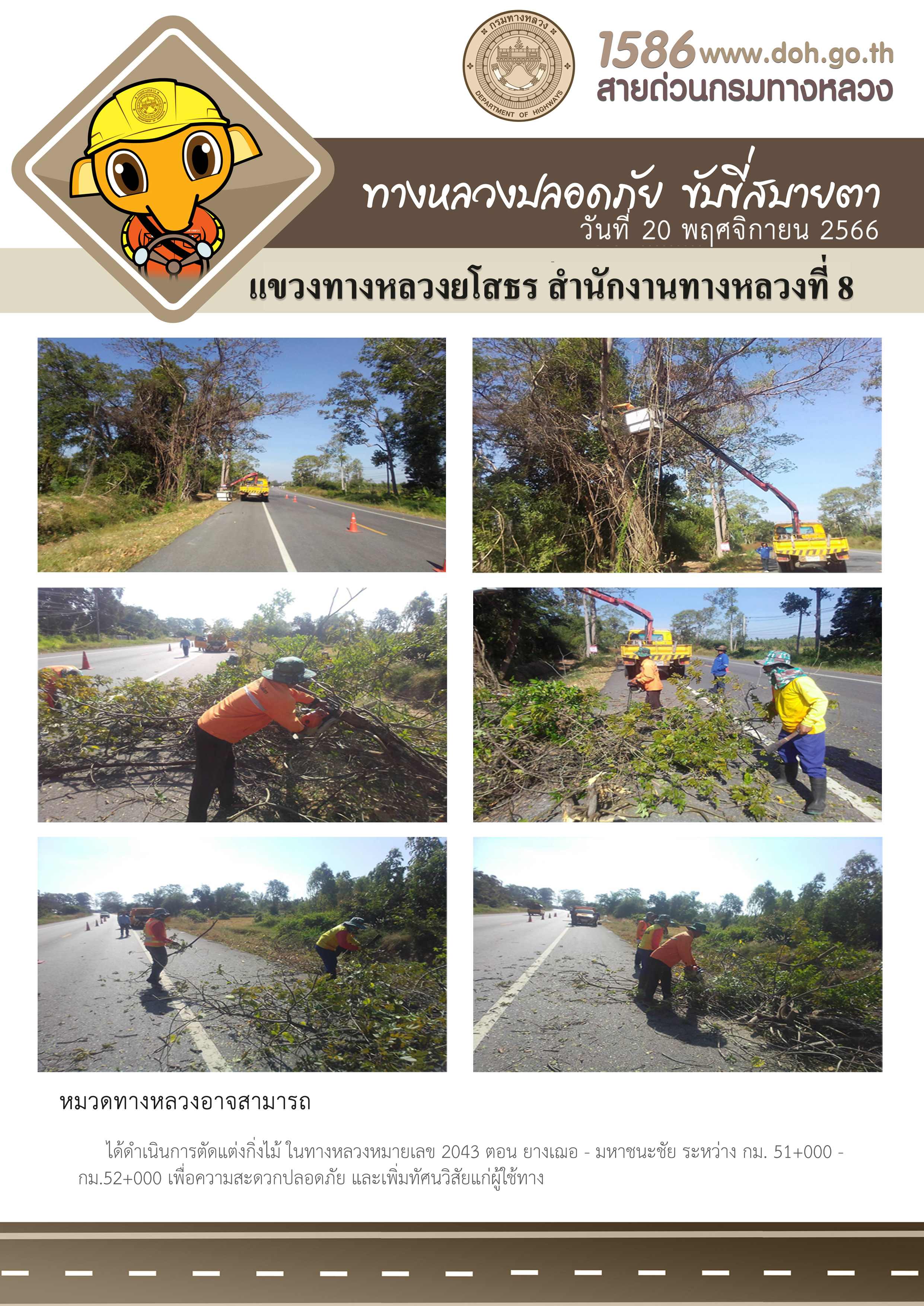 วันที่ 20 พฤศจิกายน 2566 หมวดทางหลวงอาจสามารถ ได้ดำเนินการตัดแต่งกิ่งไม้ ในทางหลวงหมายเลข 2043 ตอน ยางเฌอ - มหาชนะชัย ระหว่าง กม.51+000 - กม.52+000 เพื่อความสะดวกปลอดภัย และเพิ่มทัศนวิสัยแก่ผู้ใช้ทาง