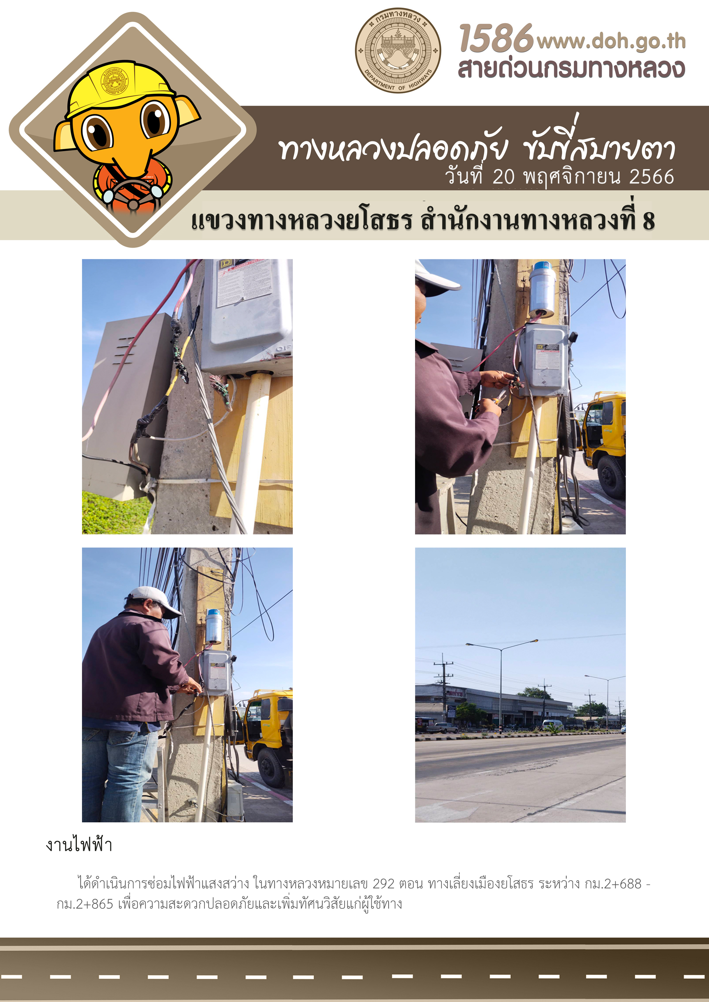 วันที่ 20 พฤศจิกายน 2566 งานไฟฟ้า ได้ดำเนินการซ่อมไฟฟ้าแสงสว่าง ในทางหลวงหมายเลข 292 ตอน ทางเลี่ยงเมืองยโสธร ระหว่าง กม.2+688 - กม.2+865 เพื่อความสะดวกปลอดภัยและเพิ่มทัศนวิสัยแก่ผู้ใช้ทาง