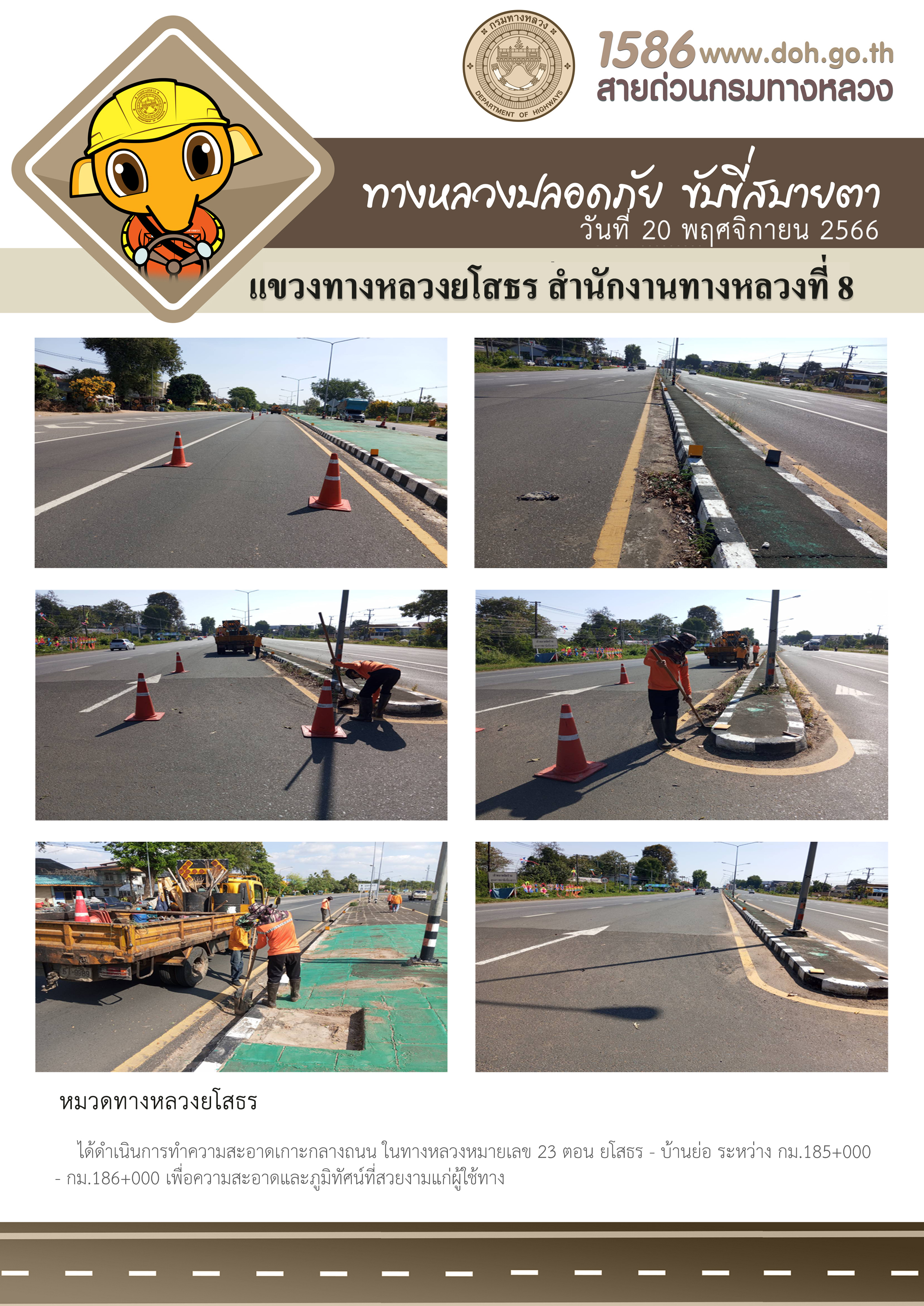 วันที่ 20 พฤศจิกายน 2566 หมวดทางหลวงยโสธร ได้ดำเนินการทำความสะอาดเกาะกลางถนน ในทางหลวงหมายเลข 23 ตอน ยโสธร - บ้านย่อ ระหว่าง กม.185+000 - กม.186+000 เพื่อความสะอาดและภูมิทัศน์ที่สวยงามแก่ผู้ใช้ทาง