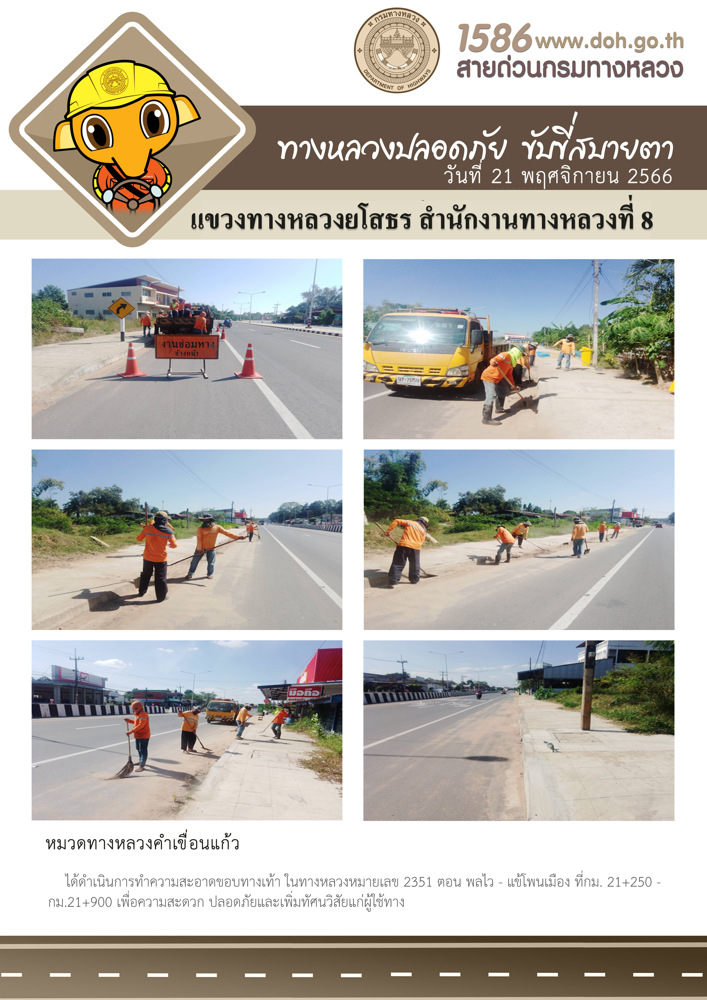 วันที่ 21 พฤศจิกายน 2566 หมวดทางหลวงคำเขื่อนแก้ว ได้ดำเนินการทำความสะอาดขอบทางเท้า ในทางหลวงหมายเลข 2351 ตอน พลไว - แข้โพนเมือง ที่ กม.21+250 - กม.21+900 เพื่อความสะดวก ปลอดภัยและเพิ่มทัศนวิสัยแก่ผู้ใช้ทาง
