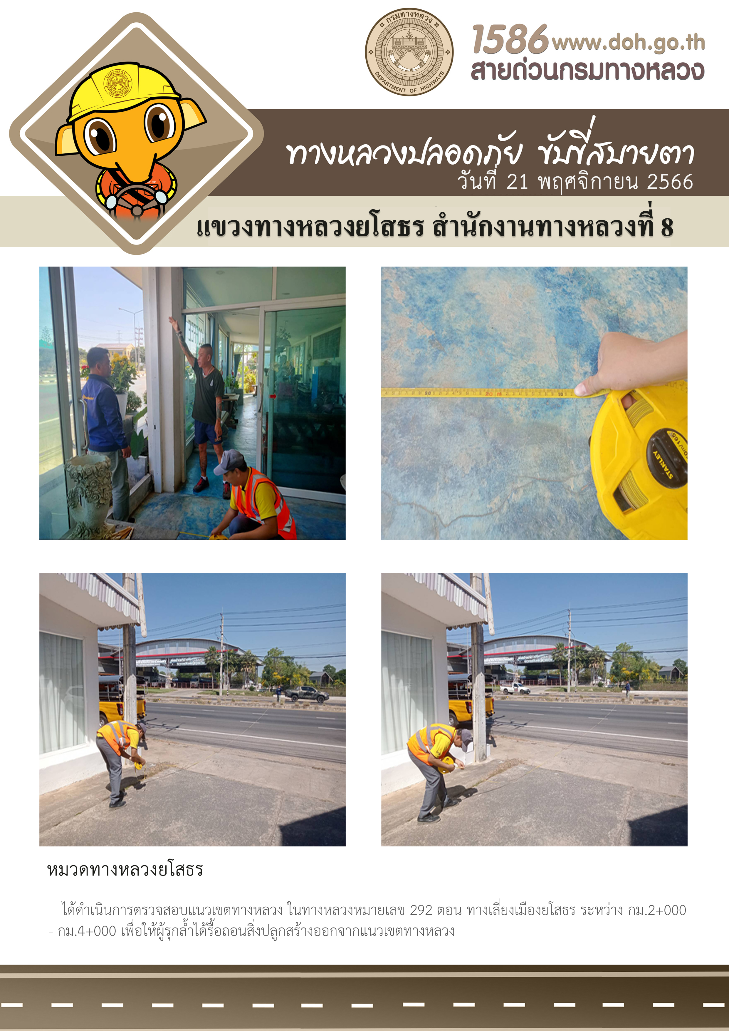 วันที่ 21 พฤศจิกายน 2566 หมวดทางหลวงยโสธร ได้ดำเนินการตรวจสอบแนวเขตทางหลวง ในทางหลวงหมายเลข 292 ตอนทางเลี่ยงเมืองยโสธร ระหว่าง กม.2+000 - กม.4+000 เพื่อให้ผู้รุกล้ำได้รื้อถอนสิ่งปลูกสร้างออกจากแนวเขตทางหลวง