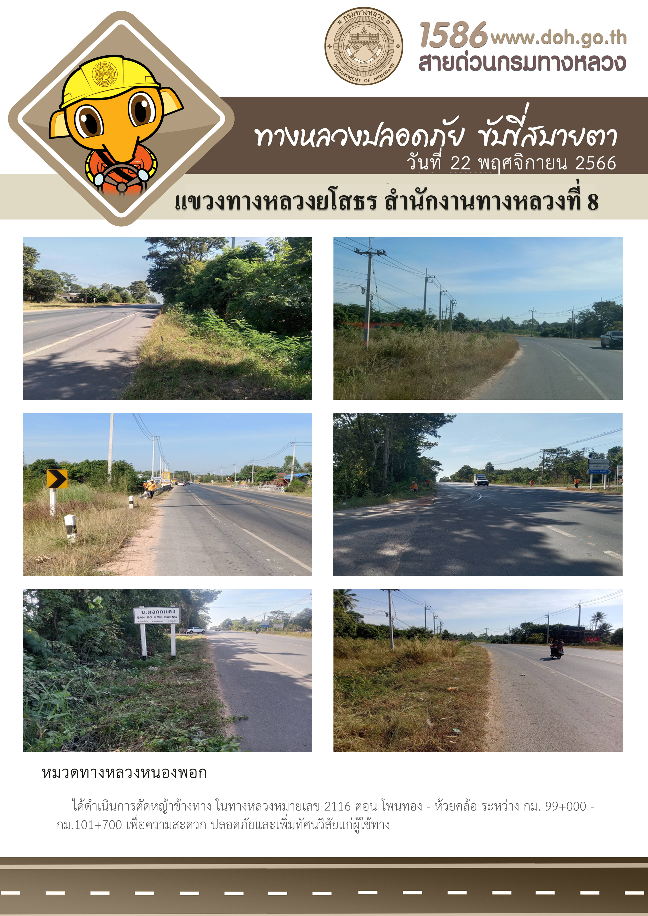 วันที่ 22 พฤศจิกายน 2566 หมวดทางหลวงหนองพอก ได้ดำเนินการตัดหญ้าข้างทาง ในทางหลวงหมายเลข 2116 ตอน โพนทอง - ห้วยคล้อ ระหว่าง กม.99+000 - กม.101+700 เพื่อความสะดวก ปลอดภัยและเพิ่มทัศนวิสัยแก่ผู้ใช้ทาง