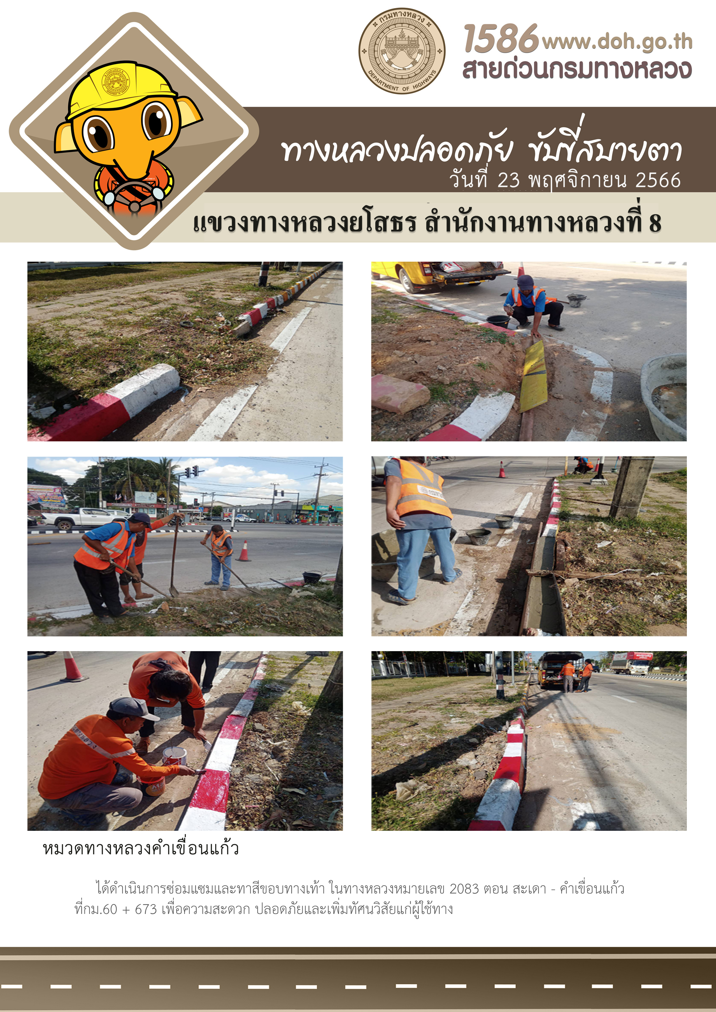 วันที่ 23 พฤศจิกายน 2566 หมวดทางหลวงคำเขื่อนแก้ว ได้ดำเนินการซ่อมแซมและทาสีขอบทางเท้า ในทางหลวงหมายเลข 2083 ตอน สะเดา - คำเขื่อนแก้ว ที่ กม.60+673 เพื่อความสะดวก ปลอดภัยและเพิ่มทัศนวิสัยแก่ผู้ใช้ทาง