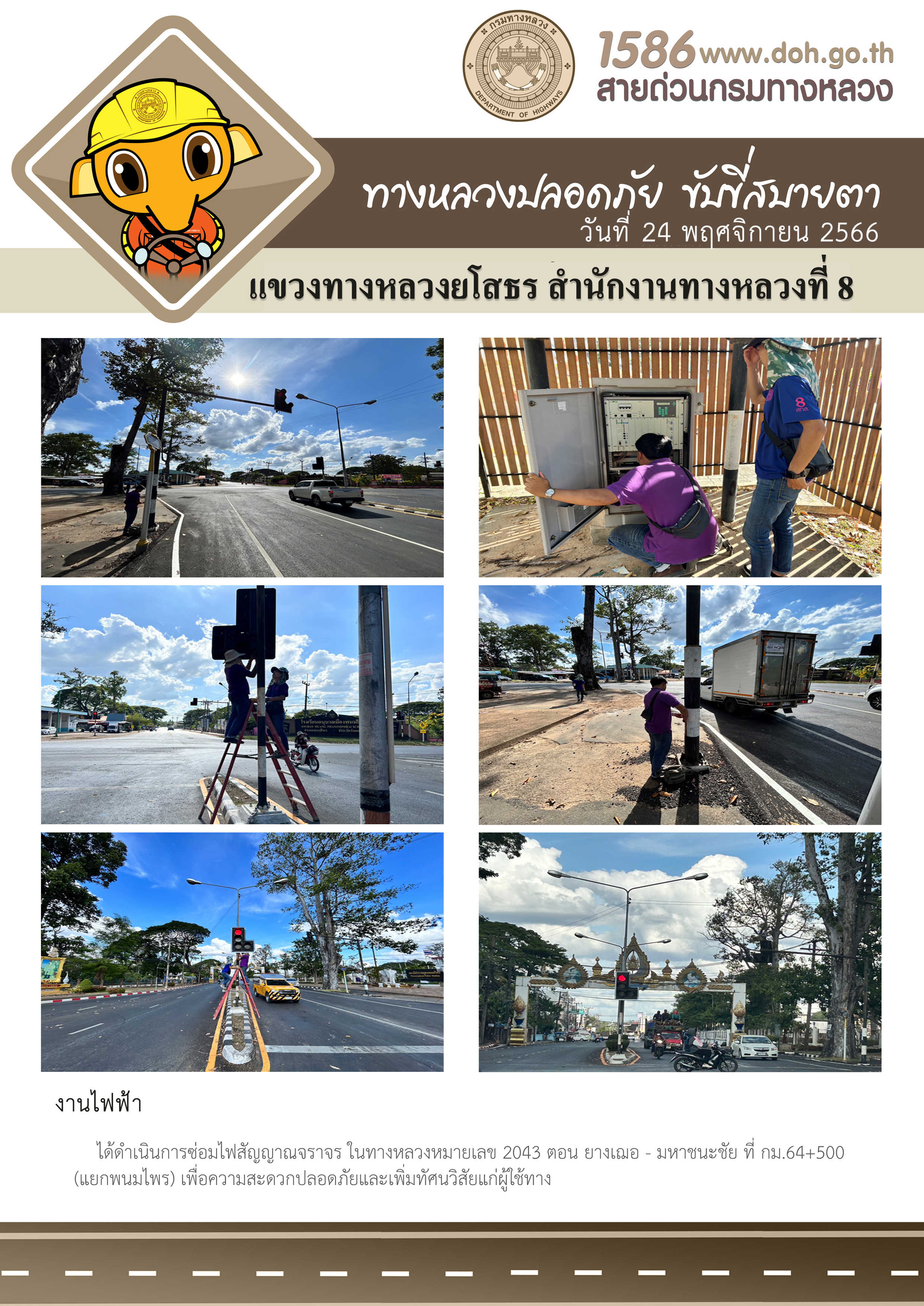 วันที่ 24 พฤศจิกายน 2566 งานไฟฟ้า ได้ดำเนินการซ่อมไฟสัญญาณจราจร ในทางหลวงหมายเลข 2043 ตอน ยางเฌอ - มหาชนะชัย ที่ กม.64+500 (แยกพนมไพร) เพื่อความสะดวกปลอดภัยและเพิ่มทัศนวิสัยแก่ผู้ใช้ทาง