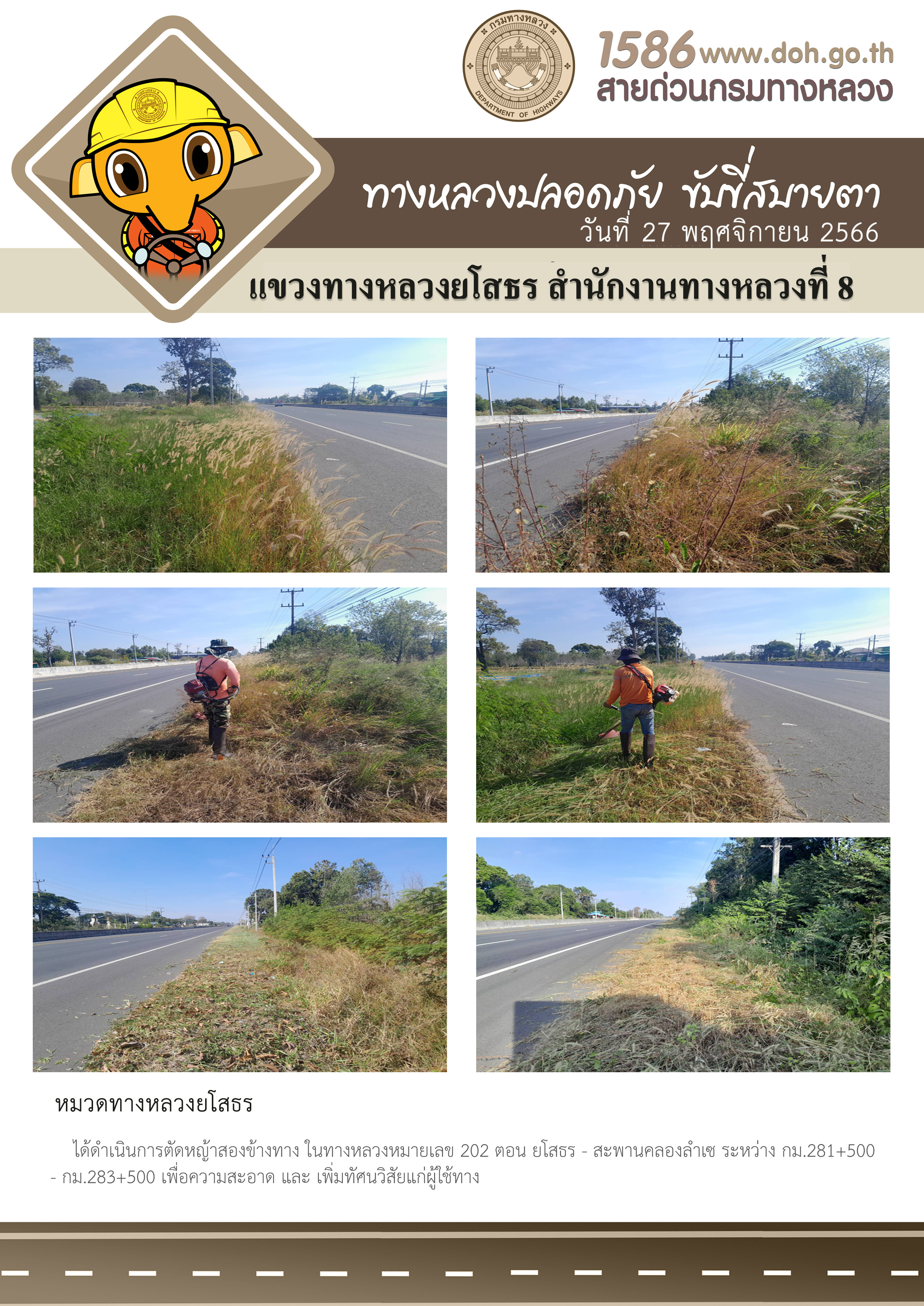 วันที่ 27 พฤศจิกายน 2566 หมวดทางหลวงยโสธร ได้ดำเนินการตัดหญ้าสองข้างทาง ในทางหลวงหมายเลข 202 ตอน ยโสธร - สะพานคลองลำเซ ระหว่าง กม.281+500 - กม.283+500 เพื่อความสะอาด และเพิ่มทัศนวิสัยแก่ผู้ใช้ทาง