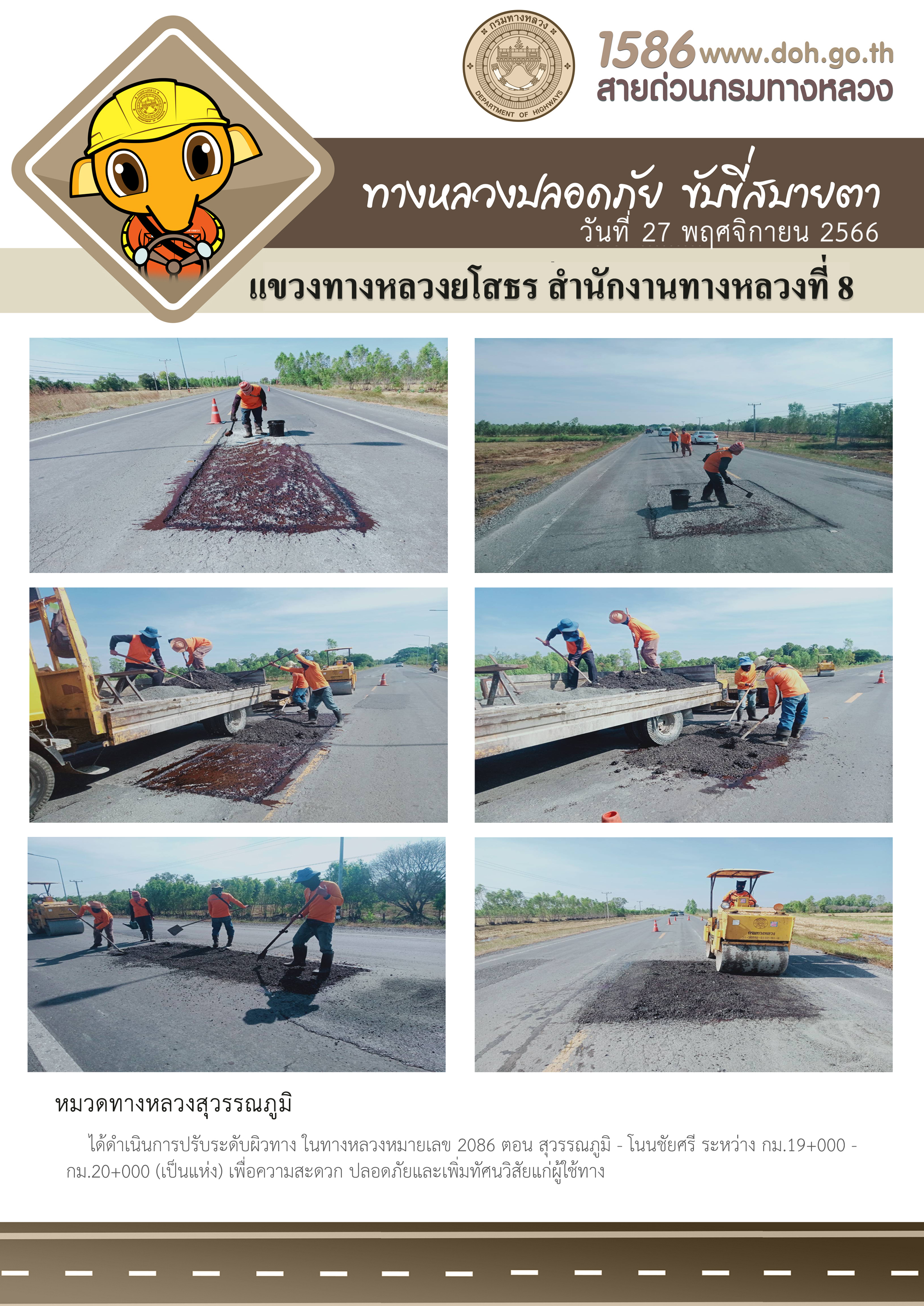 วันที่ 27 พฤศจิกายน 2566 หมวดทางหลวงสุวรรณภูมิ ได้ดำเนินการปรับระดับผิวทาง ในทางหลวงหมายเลข 2086 ตอน สุวรรณภูมิ - โนนชัยศรี ระหว่าง กม.19+000 - กม.20+000 (เป็นแห่ง) เพื่อความสะดวก ปลอดภัยและเพิ่มทัศนวิสัยแก่ผู้ใช้ทาง