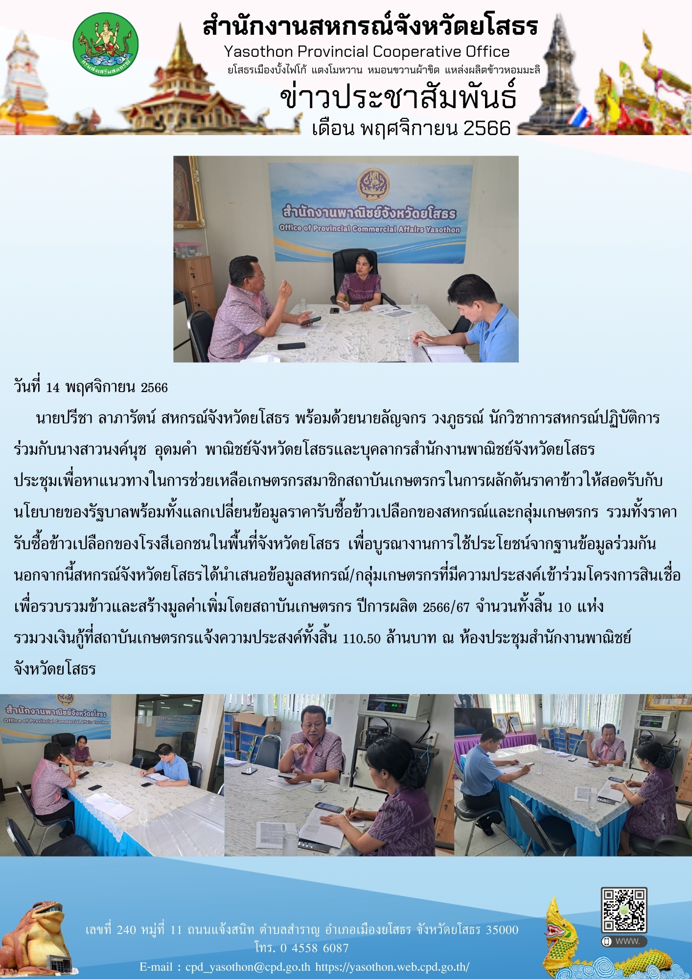 นายปรีชา ลาภารัตน์ สหกรณ์จังหวัดยโสธร พร้อมด้วยเจ้าหน้าที่สำนักงานสหกรณ์จังหวัดยโสธร ร่วมกับนางสาวนงค์นุช อุดมคำ พาณิชย์จังหวัดยโสธร ร่วมประชุมเพื่อหาแนวทางในการช่วยเหลือเกษตรกรสมาชิกสถาบันเกษตรกรในการผลักดันราคาข้าว