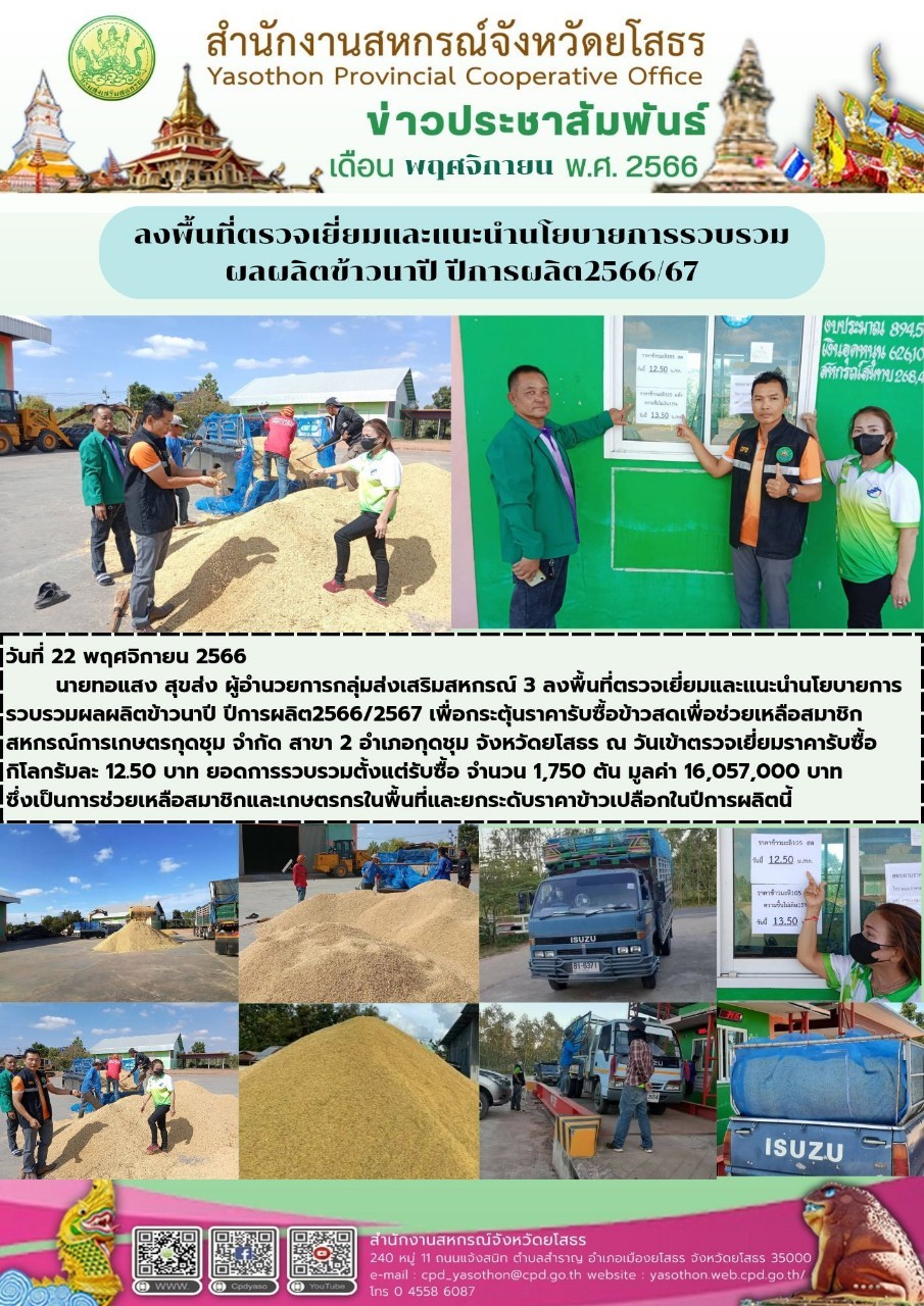 นายทอแสง สุขส่ง ผู้อำนวยการกลุ่มส่งเสริมสหกรณ์ 3 ลงพื้นที่ตรวจเยี่ยมและแนะนำนโยบายการรวบรวมผลผลิตข้าวนาปี ปีการผลิต 2566/67 เพื่อกระตุ้นราคารับซื้อ ณ สหกรณ์การเกษตรกุดชุม จำกัด