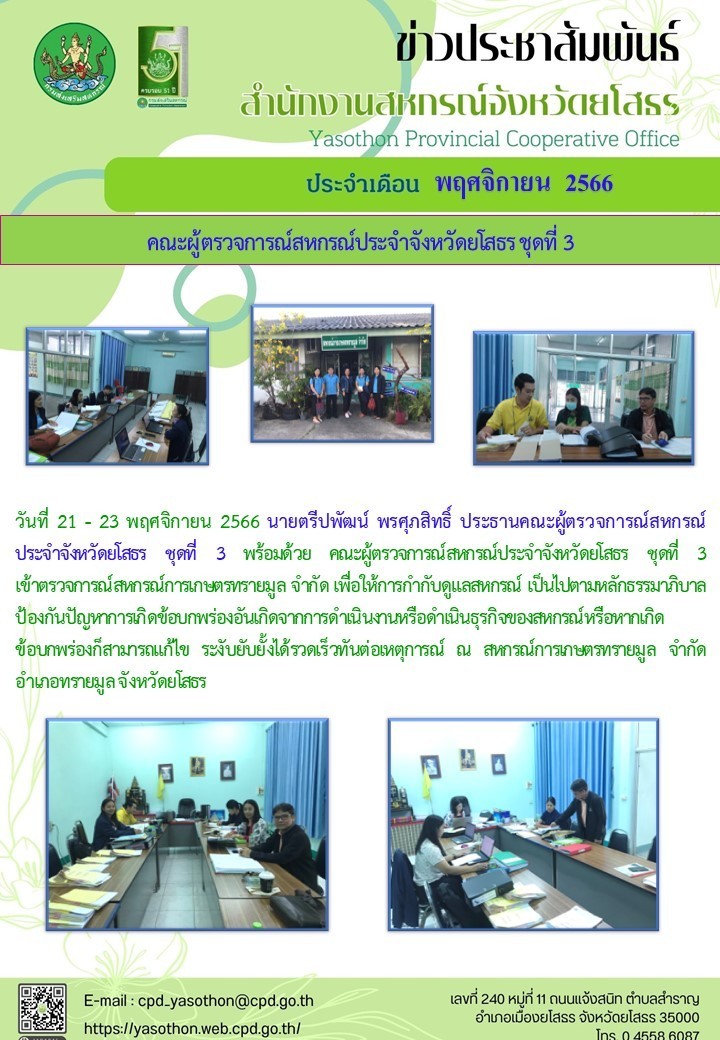 นายตรีปพัฒน์ พรศุภสิทธิ์ ผู้อำนวยการกลุ่มจัดตั้งและส่งเสริมสหกรณ์พร้อมด้วยเจ้าหน้าที่กลุ่มจัดตั้งและส่งเสริมสหกรณ์ พร้อมด้วยเจ้าหน้าที่สำนักงานสหกรณ์จังหวัดยโสธร เข้าตรวจการสหกรณ์การเกษตรทรายมูล จำกัด
