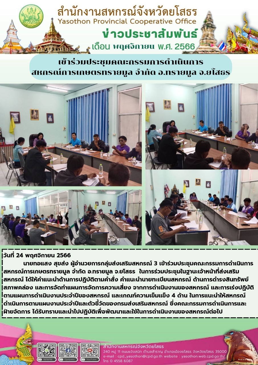 นายทอแสง สุขส่ง ผู้อำนวยการกลุ่มส่งเสริมสหกรณ์ 3 เข้าร่วมประชุมคณะกรรมการดำเนินการสหกรณ์การเกษตรทรายมูล จำกัด