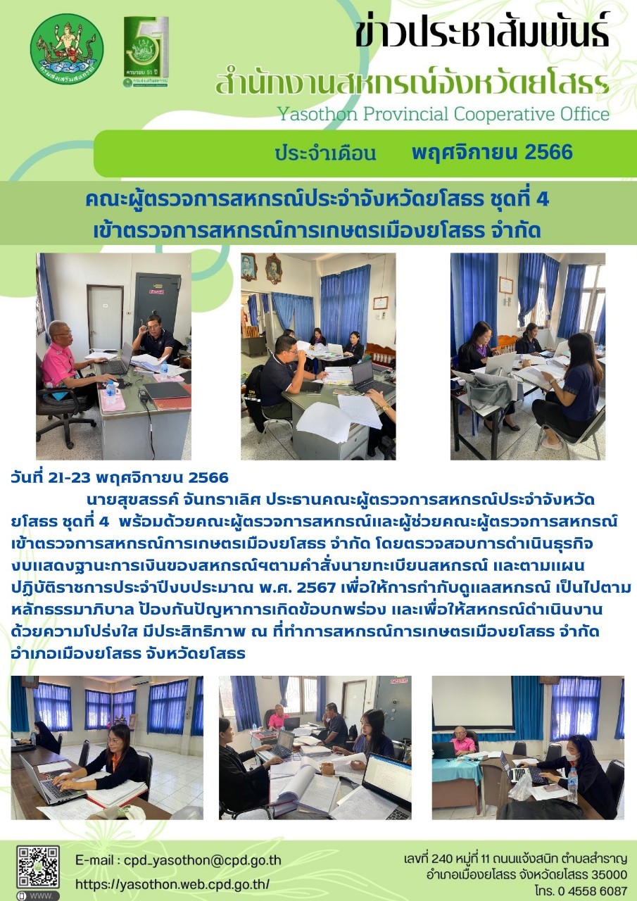 นายสุขสรรค์ จันทราเลิศ ผู้อำนวยการกลุ่มส่งเสริมสหกรณ์ 1 พร้อมด้วยคณะผู้ตรวจการสหกรณ์ เข้าตรวจการสหกรณ์การเกษตรเมืองยโสธร จำกัด