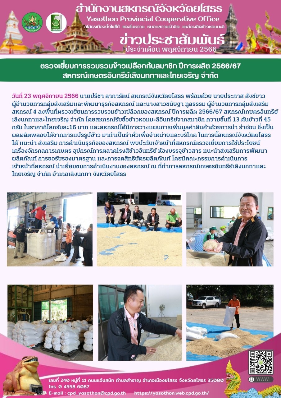 นายปรีชา ลาภารัตน์ สหกรณ์จังหวัดยโสธร พร้อมด้วยนายประภาส สังข์ขาว ผู้อำนวยการกลุ่มส่งเสริมและพัฒนาธุรกิจสหกรณ์ ลงพื้นที่ตรวจเยี่ยมการรวบรวมข้าวเปลือกของสหกรณ์ ปีการผลิต 2566/67 ณ สหกรณ์เกษตรอินทรีย์เลิงนกทาและไทยเจริญ จำกัด