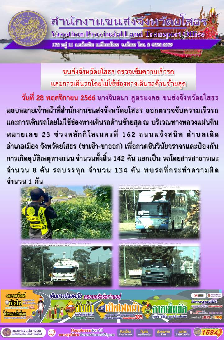 วันที่ 28 พฤศจิกายน 2566 เจ้าหน้าที่สำนักงานขนส่งจังหวัดยโสธร ออกตั้งจุดตรวจจับความเร็ว