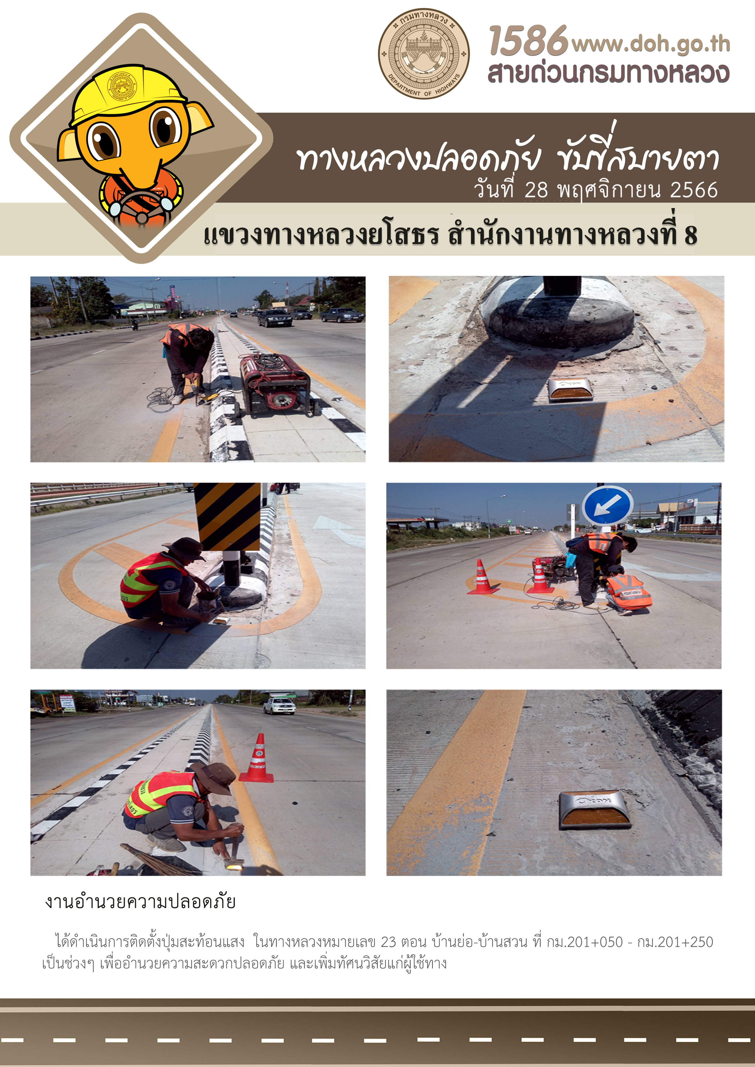 วันที่ 28 พฤศจิกายน 2566 งานอำนวยความปลอดภัย ได้ดำเนินการติดตั้งปุ่มสะท้อนแสง ในทางหลวงหมายเลข 23 ตอน บ้านย่อ-บ้านสวน ที่ กม.201+050 - กม.201+250 เป็นช่วงๆ เพื่ออำนวยความสะดวกปลอดภัย และเพิ่มทัศนวิสัยแก่ผู้ใช้ทาง