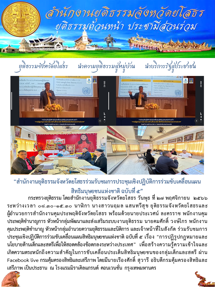 วันที่ 29 พ.ย. 2566 (17:11 น.)กระทรวงยุติธรรม โดยสำนักงานยุติธรรมจังหวัดยโสธร วันพุธ ที่ 27 พฤศจิกายน 2566 ระหว่างเวลา 08.30–15.30 นาฬิกา นางสาวนฤมล แสนทวีสุข ยุติธรรมจังหวัดยโสธรและผู้อำนวยการสำนักงานคุมประพฤติจังหวัดยโสธร พร้อมด้วยนายประเวศน์ ละครราช พนักงานคุมประพฤติชำนาญการ หัวหน้ากลุ่มพัฒนาและส่งเสริมระบบงานยุติธรรม นายคมศักดิ์ วงษ์ไกร พนักงานคุมประพฤติชำนาญ หัวหน้ากลุ่มอำนวยความยุติธรรมและนิติการ และเจ้าหน้าที่ในสังกัด ร่วมรับชมการประชุมเชิงปฏิบัติการร่วมขับเคลื่อนแผนสิทธิมนุษยชนแห่งชาติ ฉบับที่ 5 เรื่อง “การปฏิรูปกฎหมายและนโยบายด้านเด็กและสตรีเพื่อให้สอดคล้องข้อตกลงระหว่างประเทศ” เพื่อสร้างความรู้ความเข้าใจและเกิดความตระหนักถึงความสำคัญในการขับเคลื่อนประเด็นสิทธิมนุษยชนของกลุ่มเด็กและสตรี ผ่านFacebook live กรมคุ้มครองสิทธิและเสรีภาพ โดยมีนายเรืองศักดิ์ สุวารี อธิบดีกรมคุ้มครองสิทธิและเสรีภาพ เป็นประธาน ณ โรงแรมมิราเคิลแกรนด์ คอนเวนชั่น กรุงเทพมหานคร