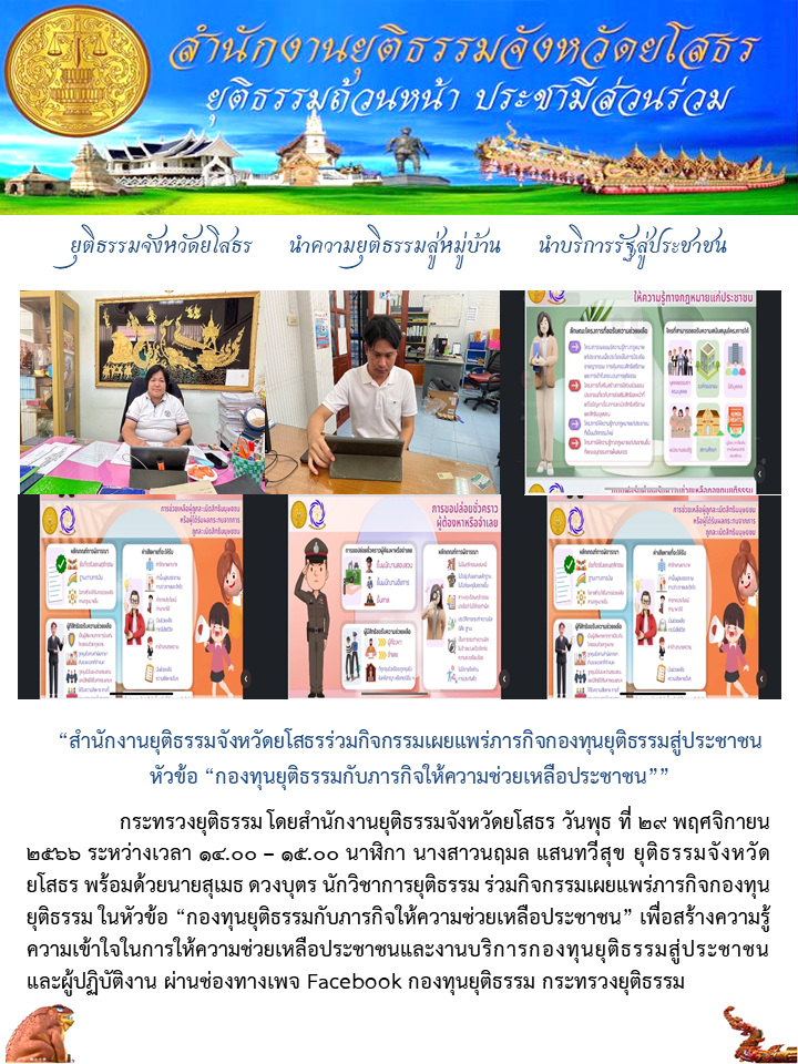 วันที่ 29 พ.ย. 2566 (17:17 น.)กระทรวงยุติธรรม โดยสำนักงานยุติธรรมจังหวัดยโสธร วันพุธ ที่ 29 พฤศจิกายน 2566 ระหว่างเวลา 14.00 – 15.00 นาฬิกา นางสาวนฤมล แสนทวีสุข ยุติธรรมจังหวัดยโสธร พร้อมด้วยนายสุเมธ ดวงบุตร นักวิชาการยุติธรรม ร่วมกิจกรรมเผยแพร่ภารกิจกองทุนยุติธรรม ในหัวข้อ “กองทุนยุติธรรมกับภารกิจให้ความช่วยเหลือประชาชน” เพื่อสร้างความรู้ความเข้าใจในการให้ความช่วยเหลือประชาชนและงานบริการกองทุนยุติธรรมสู่ประชาชน และผู้ปฏิบัติงาน ผ่านช่องทางเพจ Facebook กองทุนยุติธรรม กระทรวงยุติธรรม