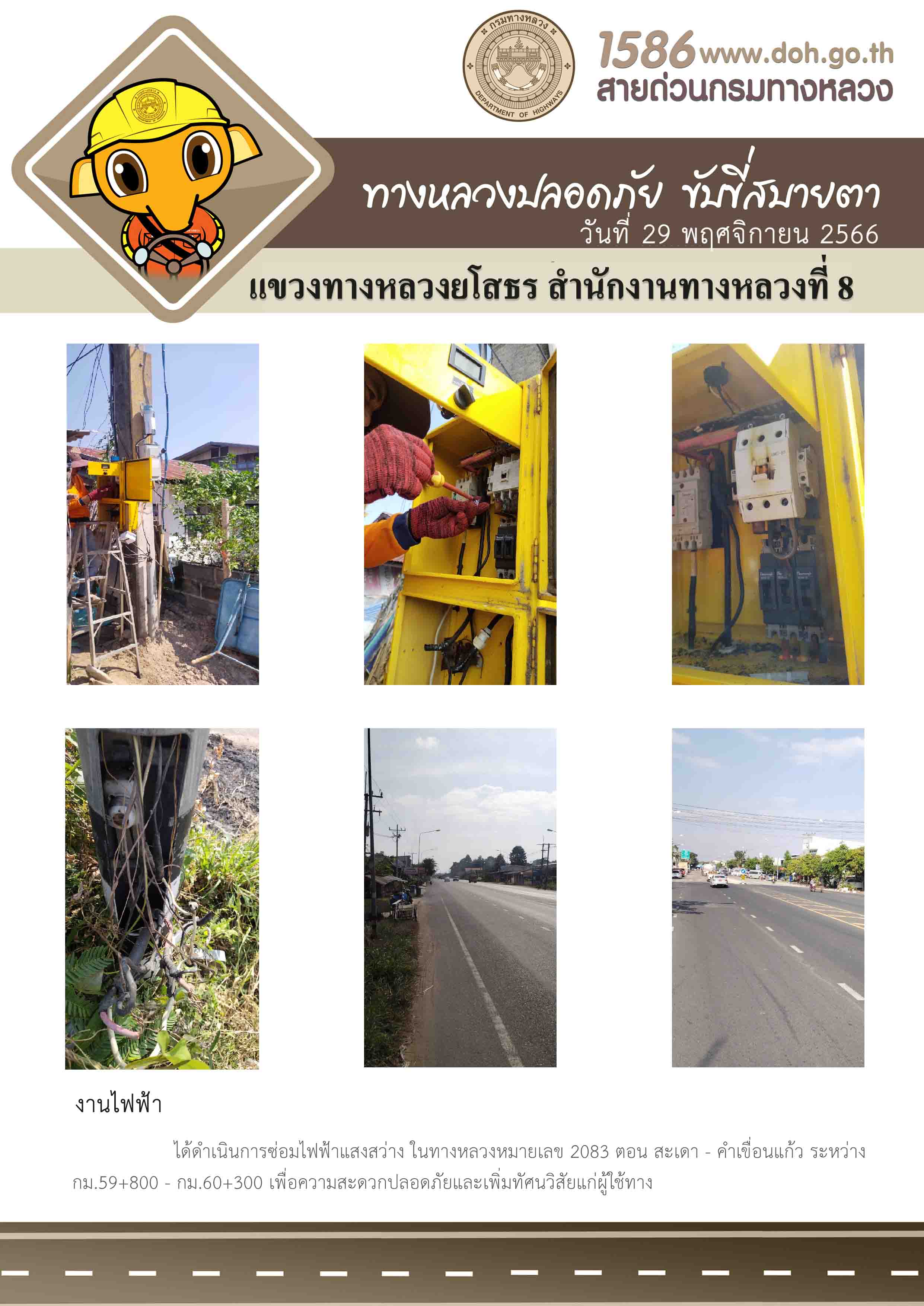 วันที่ 29 พฤศจิกายน 2566 งานไฟฟ้า ได้ดำเนินการซ่อมไฟฟ้าแสงสว่าง ในทางหลวงหมายเลข 2083 ตอน สะเดา - คำเขื่อนแก้ว ระหว่าง กม.59+800 - กม.60+300 เพื่อความสะดวกปลอดภัยและเพิ่มทัศนวิสัยแก่ผู้ใช้ทาง