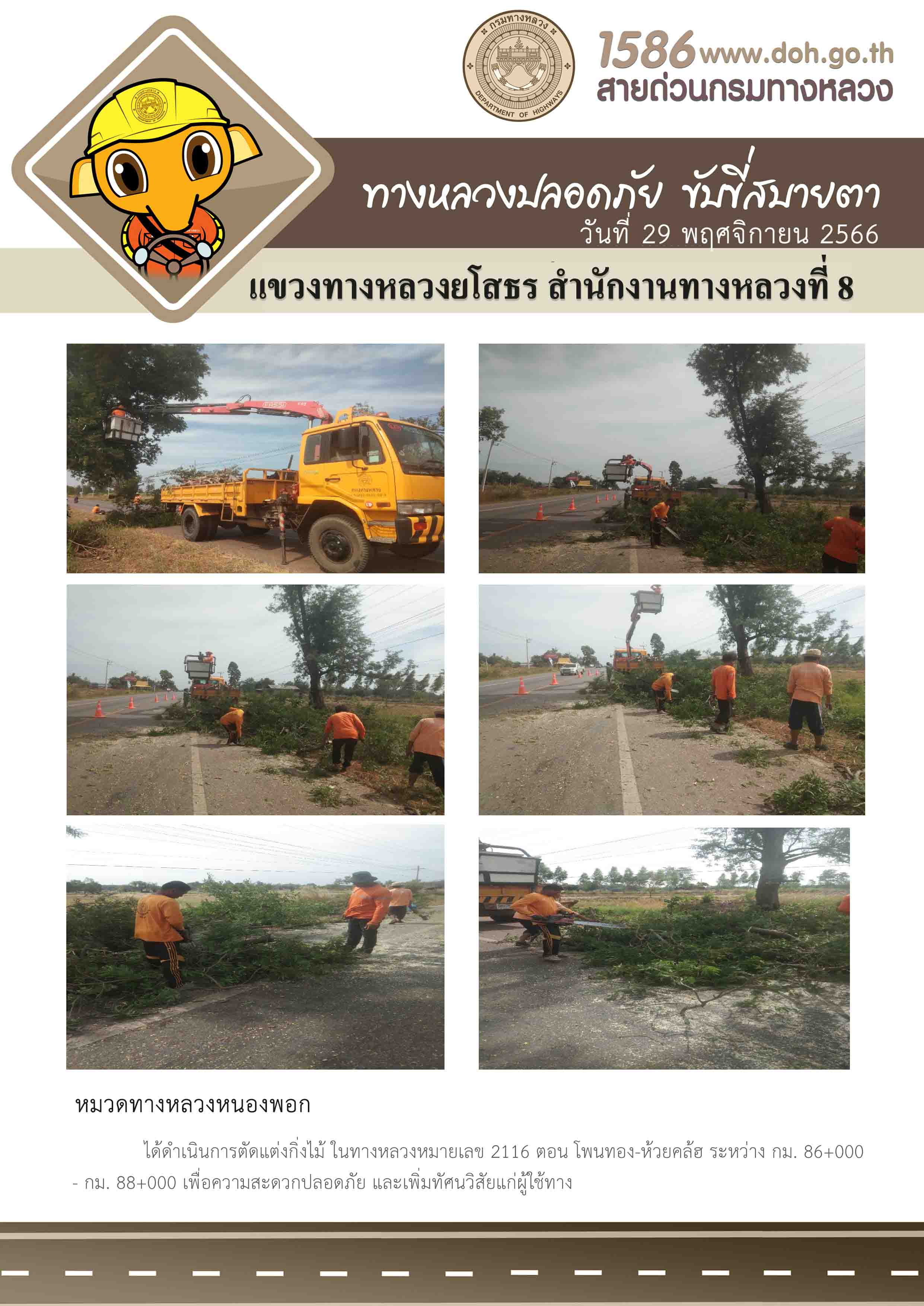 วันที่ 29 พฤศจิกายน 2566 หมวดทางหลวงหนองพอก ได้ดำเนินการตัดแต่งกิ่งไม้ ในทางหลวงหมายเลข 2116 ตอน โพนทอง-ห้วยคล้อ ระหว่าง กม.86+000 - กม.88+000 เพื่อความสะดวกปลอดภัย และเพิ่มทัศนวิสัยแก่ผู้ใช้ทาง