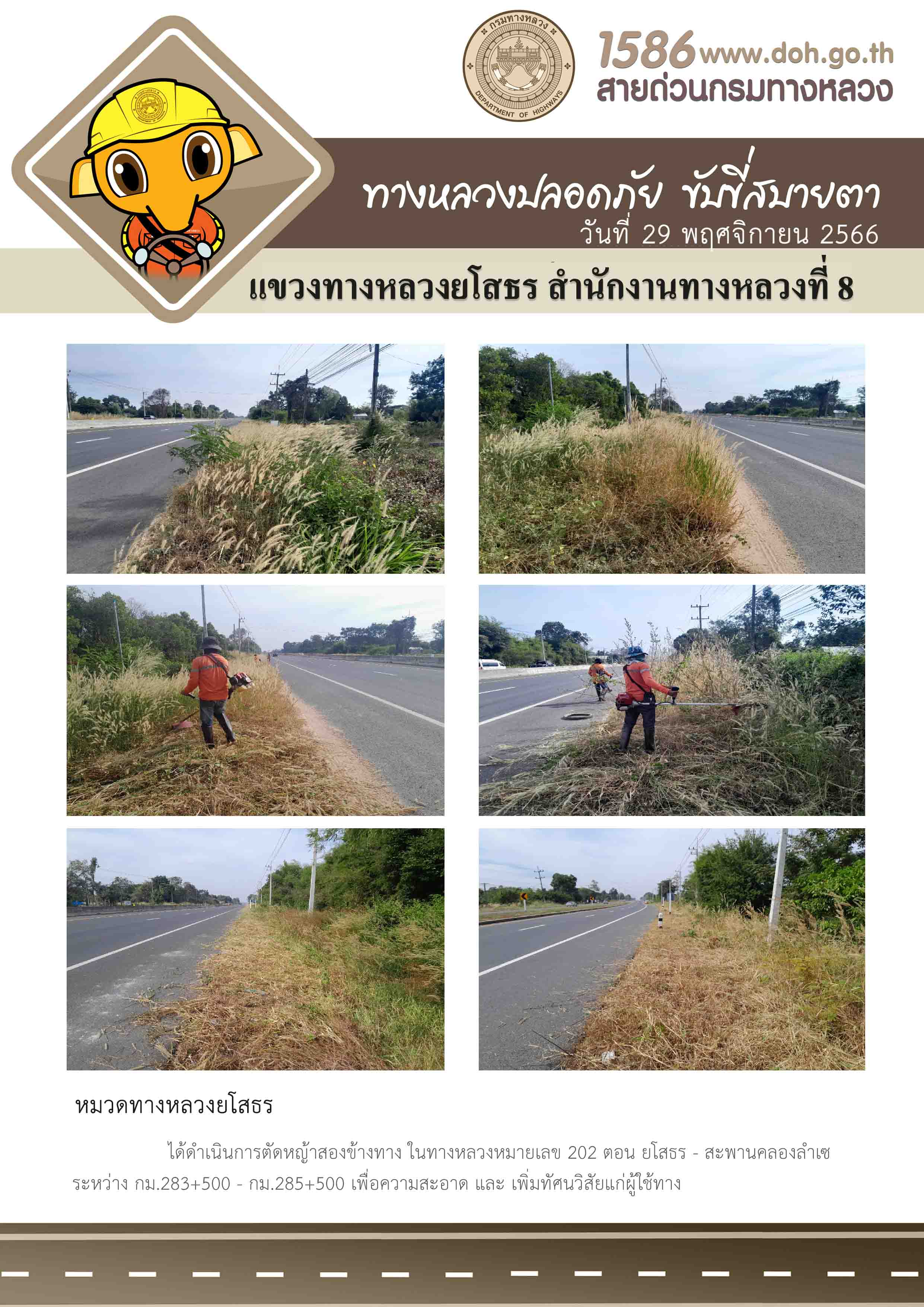 วันที่ 29 พฤศจิกายน 2566 หมวดทางหลวงยโสธร ได้ดำเนินการตัดหญ้าสองข้างทาง ในทางหลวงหมายเลข 202 ตอน ยโสธร - สะพานคลองลำเซ ระหว่าง กม.283+500 - กม.285+500 เพื่อความสะอาด และเพิ่มทัศนวิสัยแก่ผู้ใช้ทาง