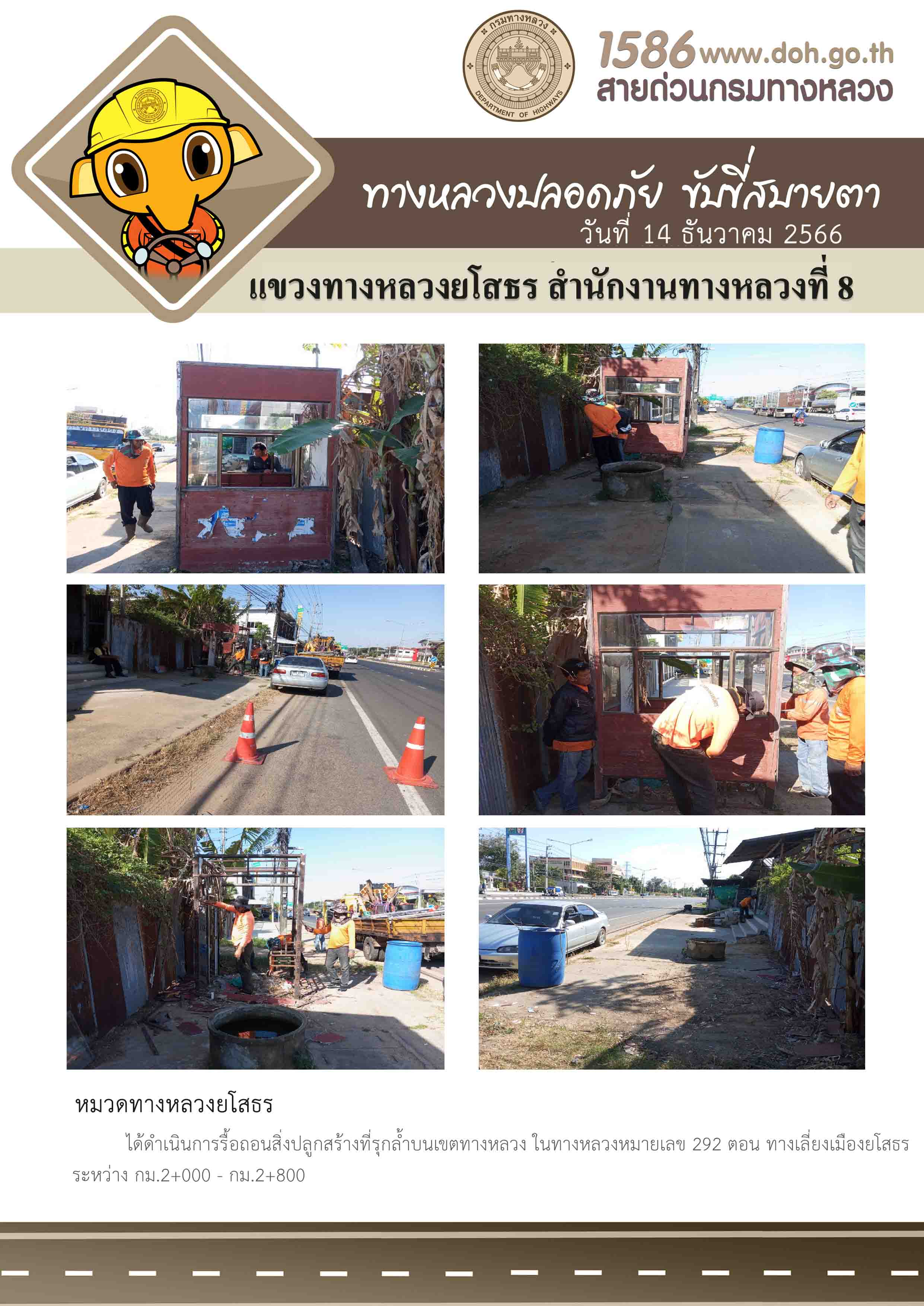 วันที่ 14 ธันวาคม 2566 หมวดทางหลวงยโสธร ได้ดำเนินการรื้อถอนสิ่งปลูกสร้างที่รุกล้ำบนเขตทางหลวง ในทางหลวงหมายเลข 292 ตอน ทางเลี่ยงเมืองยโสธร ระหว่าง กม.2+000 - กม.2+800