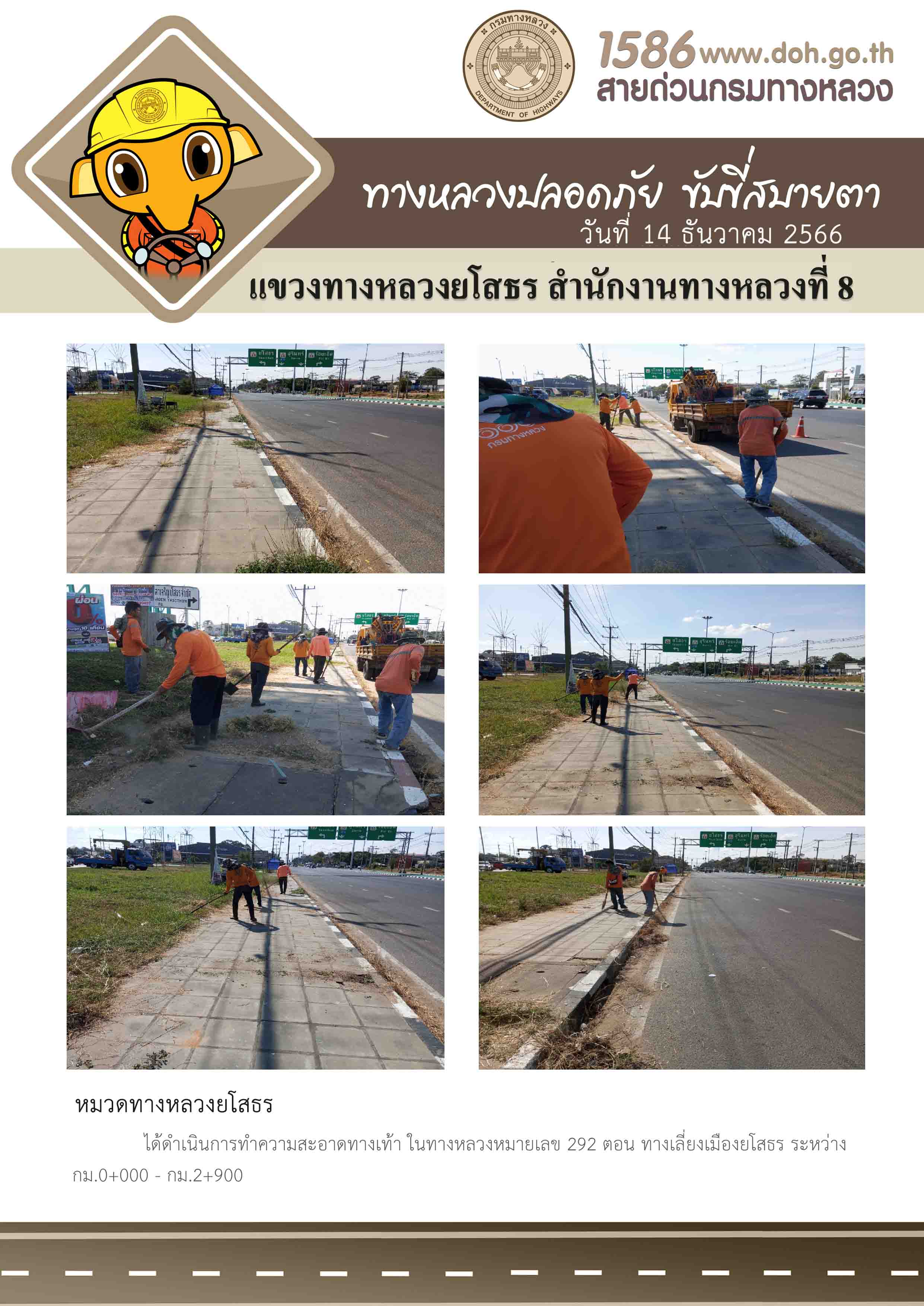วันที่ 14 ธันวาคม 2566 หมวดทางหลวงยโสธร ได้ดำเนินการทำความสะอาดทางเท้า ในทางหลวงหมายเลข 292 ตอน ทางเสี่ยงเมืองยโสธร ระหว่าง กม.0+000 - กม.2+900