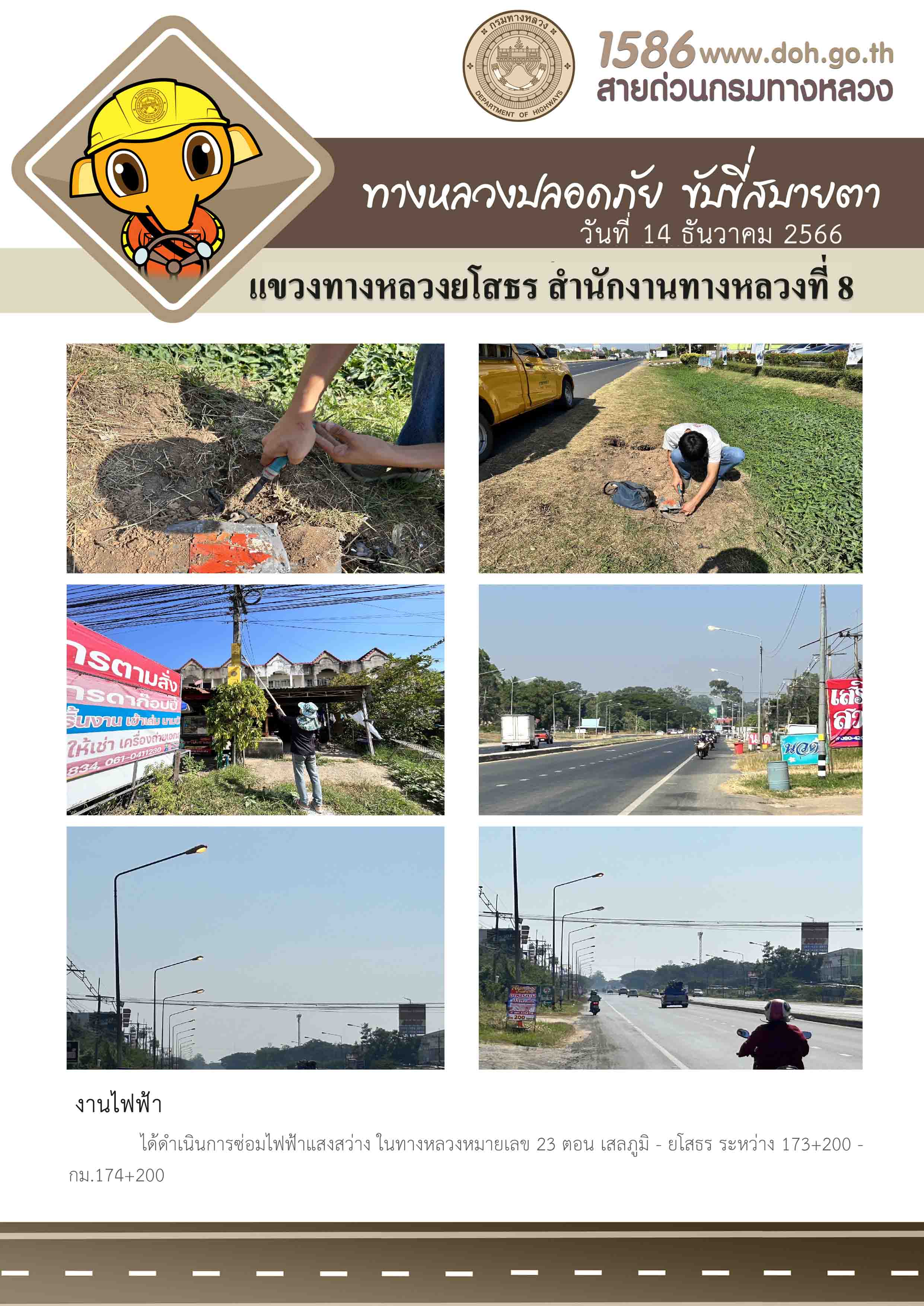 วันที่ 14 ธันวาคม 2566 งานไฟฟ้า ได้ดำเนินการซ่อมไฟฟ้าแสงสว่าง ในทางหลวงหมายเลข 23 ตอน เสลภูมิ - ยโสธร ระหว่าง 173+200 - กม.174+200