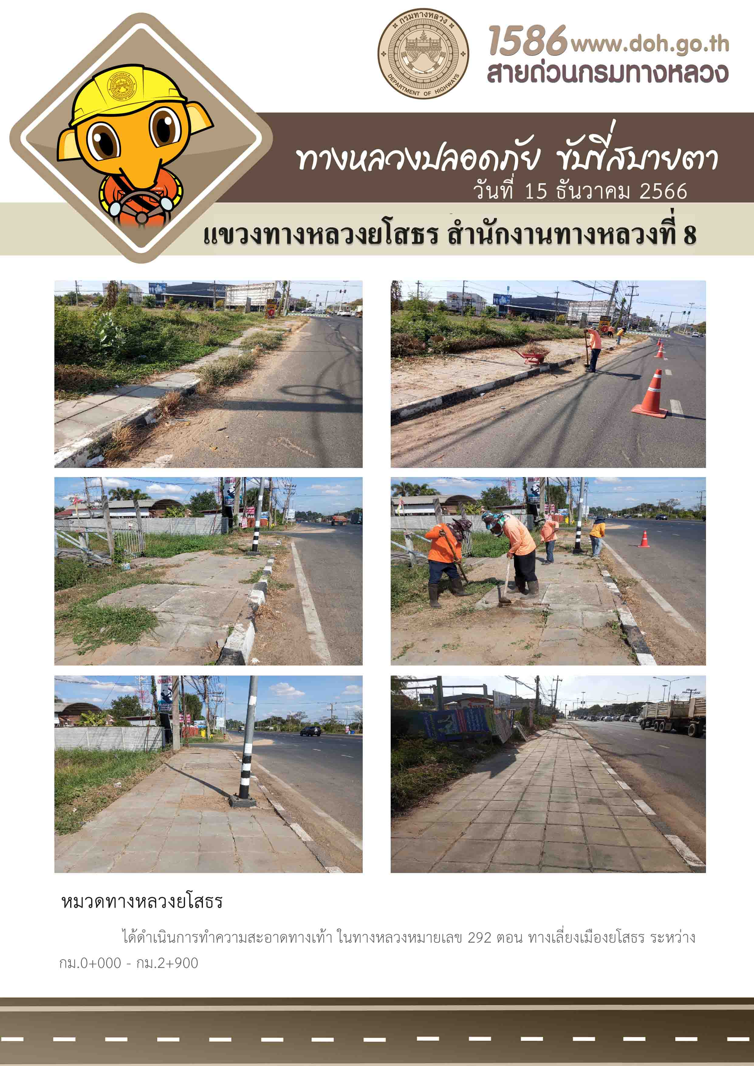 วันที่ 15 ธันวาคม 2566 หมวดทางหลวงยโสธร ได้ดำเนินการทำความสะอาดทางเท้า ในทางหลวงหมายเลข 292 ตอน ทางเลี่ยงเมืองยโสธร ระหว่าง กม.0+000 - กม.2+900