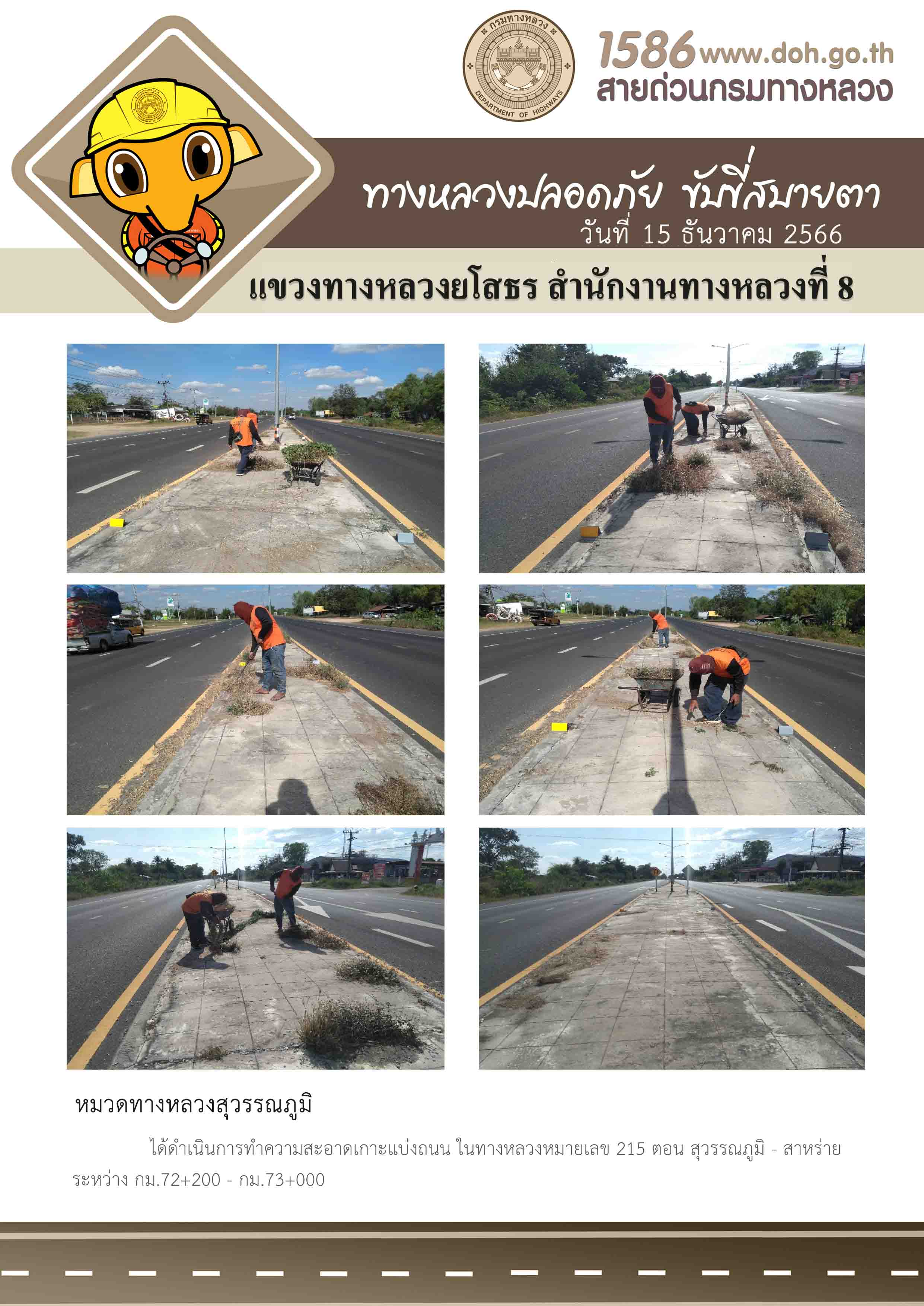 วันที่ 15 ธันวาคม 2566 หมวดทางหลวงสุวรรณภูมิ ได้ดำเนินการทำความสะอาดเกาะแบ่งถนน ในทางหลวงหมายเลข 215 ตอน สุวรรณภูมิ - สาหร่าย ระหว่าง กม.72+200 - กม.73+000